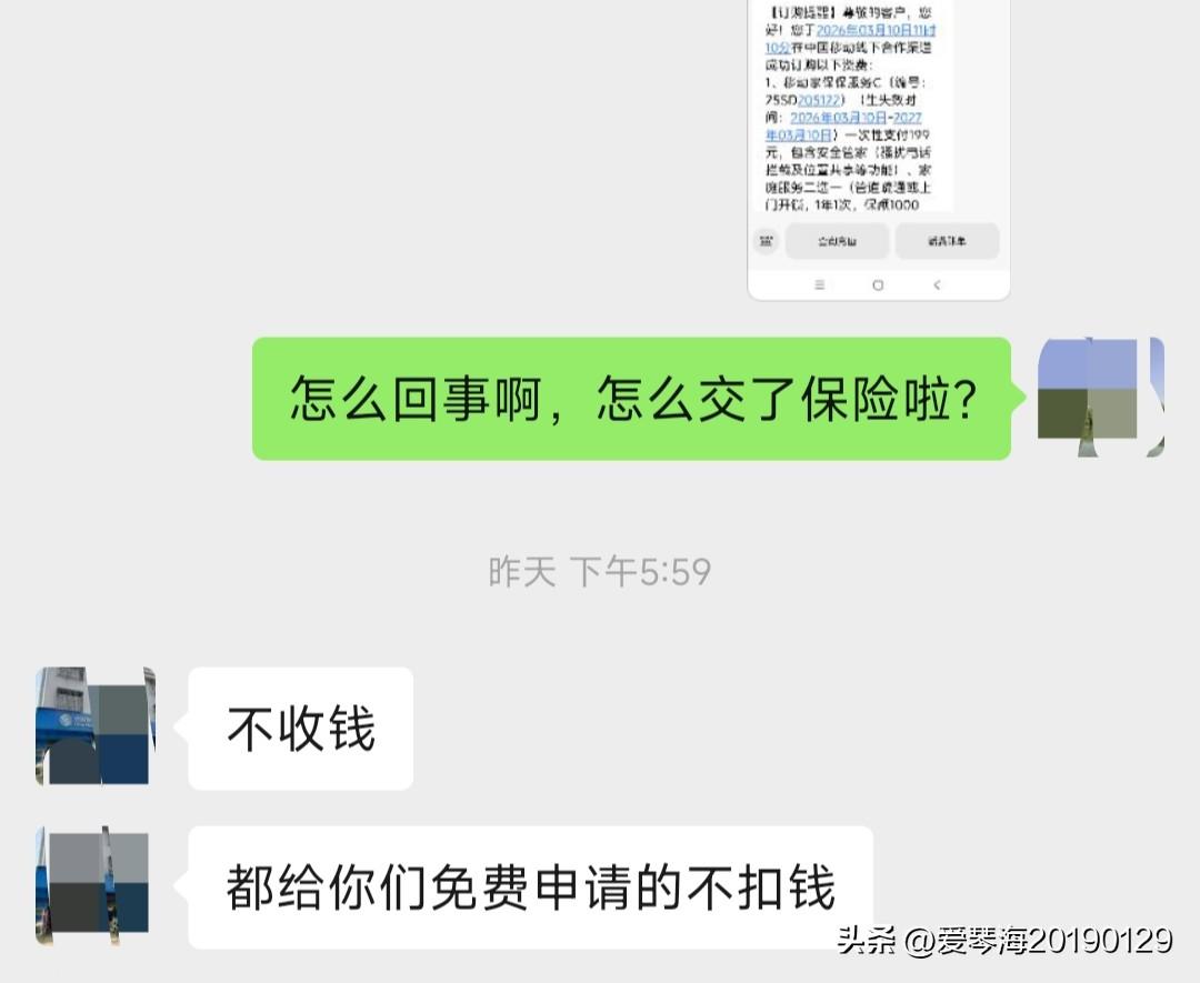 我好像有点太容易相信别人了,昨天下午,在回单位的路上接到了一个陌生电话号码,听声音对方是一小姑娘,她自称是移动营业厅的,说以我目前的资费情况,可以免费送通话时长或者流量,问我选哪样? 我说那就通话时长吧,因为每月的流量我用不完,通话时长有时候却不够。然后,她又加我微信,回到单位后,我通过了。 过了一会,她跟我视频通话,我也没有拒绝,她跟我说了我的套餐情况,还说给我取消了一项不常用的收费业务,然后又办理赠通话时长的业务。我心里想,现在服务怎么这么贴心?知道大家都很忙,没空去营业厅,移动服务人员主动线上办理,值得点赞。 吃过晚饭,翻看手机的时候看到几条未读信息,打开后发现是移动发来的,第一条内容是说赠送了综合意外保险,第二条是说保费是199元以及一些保险内容,第三条就是小姑娘给我取消的业务提醒。 我的手机是预付费的,余额也就几十块钱,这个199的保险费肯定不是实际支付的,可是我怕以后是个坑,于是在微信上问那个移动的小姑娘,小姑娘也是满口答应不会增加我的消费。 移动营业厅离我家不远,她要是坑我,我肯定饶不了她,可是费这么大的周折,就为了免费送我这个“综合意外保险”吗?她到底图啥? 有知道的网友吗?大家说说看。