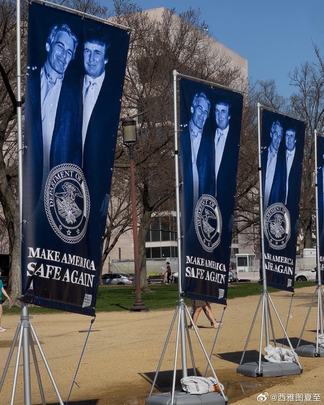 美国首都的街头,竖立起Trump和Epstein的雕像(模仿泰坦尼克号)和标语(模仿MAGA口号)