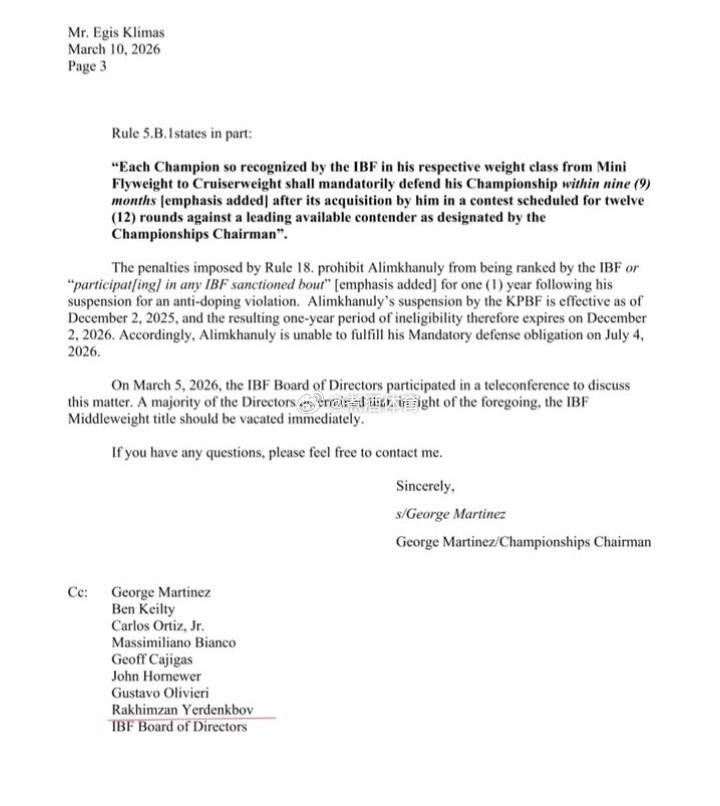 贾尼别克·阿里姆哈努利(Janibek Alimkhanuly)已被剥夺IBF中量级世界拳王头衔。原因包括多次违反规则,其中涉及使用兴奋剂。贾尼别克此前在去年11月接受的VADA检测中未能通过。