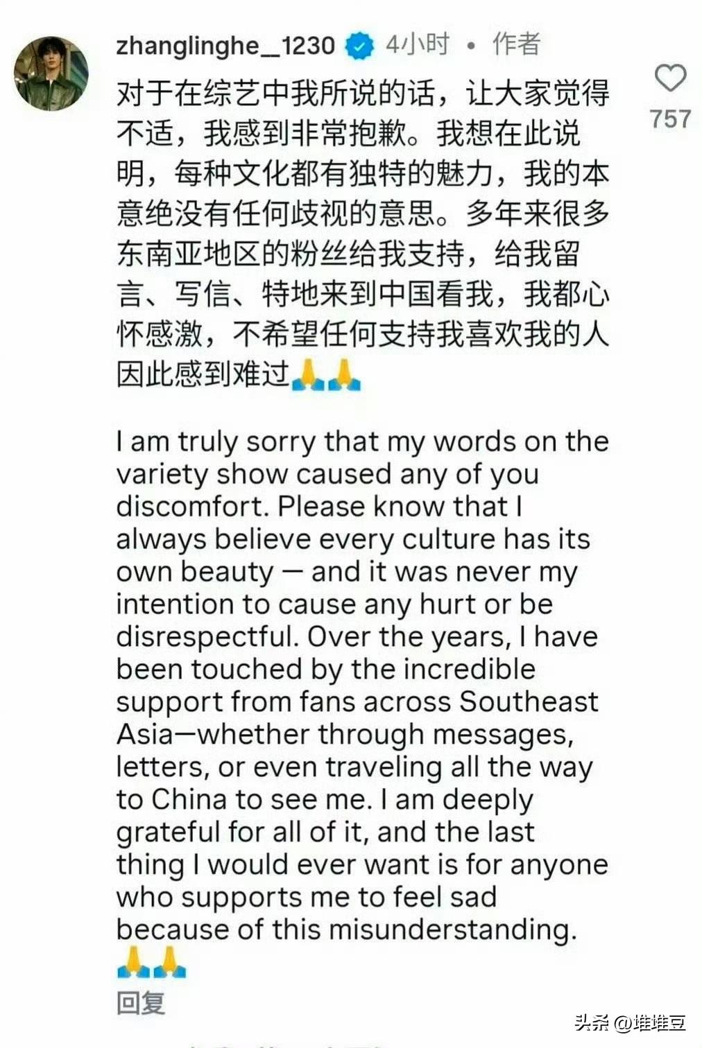 张凌赫的玩笑虽无心, 但换成我们, 真的也会不舒服 张凌赫在综艺里被画了抽象肖像,随口一句: “我感觉出生在东南亚。” 他大概率真的只是开玩笑、无心之说,没有恶意,也没有要歧视谁的意思。 后来他也及时道歉,说很感谢东南亚的粉丝。 但为什么东南亚网友还是会觉得被冒犯、不接受? 其实换个角度一想,大家就能完全理解。 如果有国外明星,看到一张不太好看、眼睛很小的卡通画, 笑着来一句:“我感觉出生在中国。” 我们听了,心里也会觉得: 这是拿长相刻板印象开玩笑,很不礼貌,也很冒犯。 将心比心,道理是一样的。 张凌赫可能真的只是说话没过脑子, 可玩笑一旦跨了文化、跨了地域, 分寸就很容易出错。 无心不代表没错,冒犯也不一定要故意。 希望这件事能让更多人明白: 拿地域和长相当梗,从来都不是幽默。 多一点换位思考,少一点无心之失,就好。 张凌赫 理性看待 换位思考 明星言论