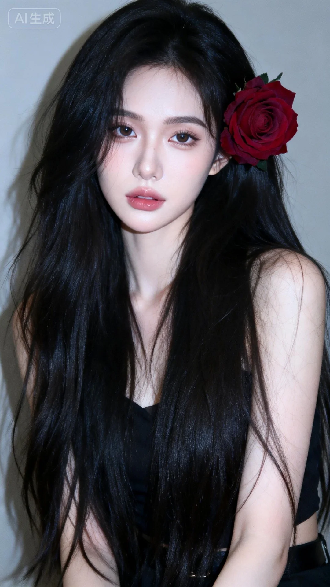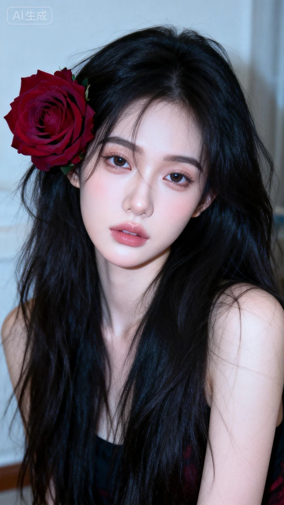 一位长发及腰模样可爱的女生,构图随意却尽显生活中的绚丽日常,人像摄影,日常快照风格,非精心构图或打光,妖冶少女,身材娇好,高颜值,冷白皮,时尚穿搭,瓜子脸尖下巴,皮肤白皙,底妆通透,肤色均匀自然,纯欲风。光线柔和自然,非均匀打光,表情自然松弛,照片毫无修饰感,带有生活真实感。ccd拍照感,真人真实,黄金比例大师摄影手。75c,个性视角,一位长直发、头发凌乱披散且皮肤白皙水嫩少女,黑色长发上,一大朵盛开的暗红色玫瑰花,五官立体,艺术感 半身特写