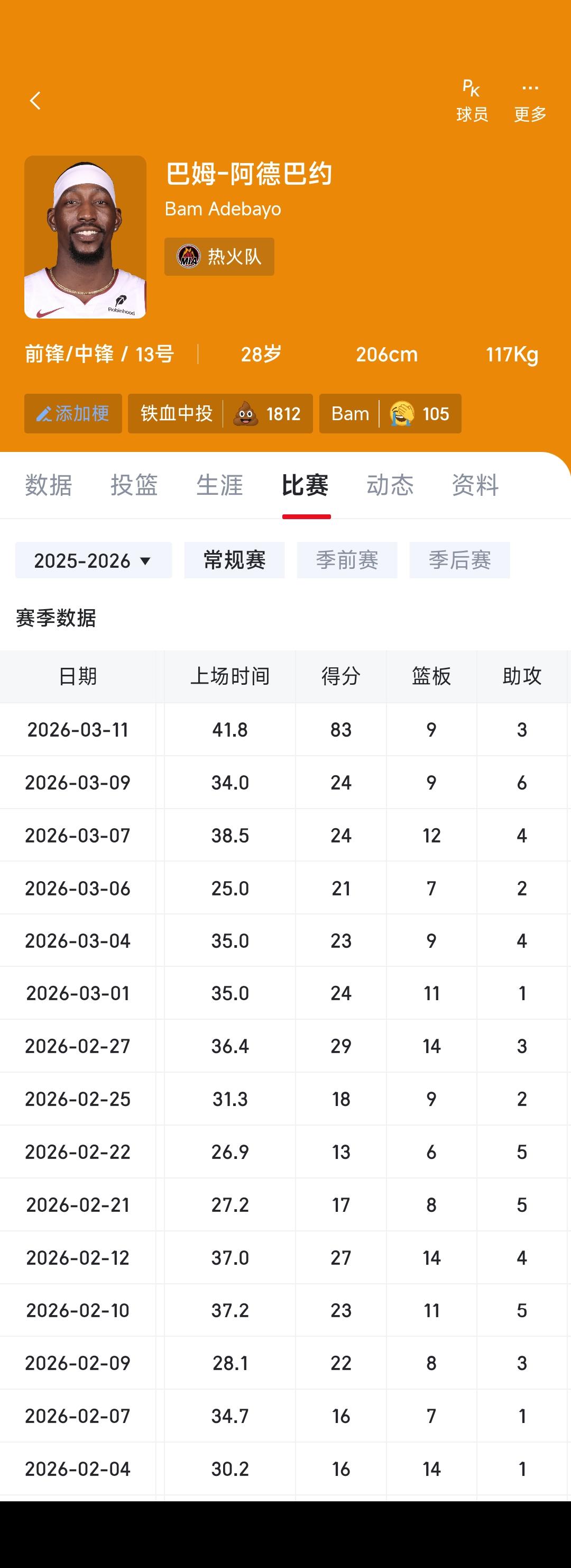 阿德巴约本场83分很反常,他平时20分上下,本赛季场均18.9分。 怎么突然一场比赛80+得分。 科比球迷很不服气,小球时代,遥遥领先还刷分,球队150分他83分.... 我现在关注点有两个,阿德巴约之后的比赛,以及其他球星会不会也来刷分![大金牙]