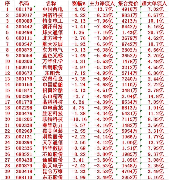 3月11日上午盘,主力趁低位,大幅买入的30名单 阳光电源:涨幅 +10.06%(涨停),主力净流入 17.5亿元 宁德时代:涨幅 +5.93%,主力净流入 13.1亿元 中国能建:涨幅 +9.87%(接近涨停),主力净流入 11.7亿元 比亚迪:涨幅 +2.89%,主力净流入 9.60亿元 亿纬锂能:涨幅 +8.59%,主力净流入 9.11亿元 3月11日中午收盘,主力资金“大幅卖出”的30名单: 中国西电:涨幅 -4.05%,主力净流入 -13.7亿元 网宿科技:涨幅 -4.22%,主力净流入 -8.23亿元 特变电工:涨幅 -2.13%,主力净流入 -7.96亿元 润泽科技:涨幅 -3.41%,主力净流入 -7.88亿元 烽火通信:涨幅 +1.26%,主力净流入 -7.16亿元