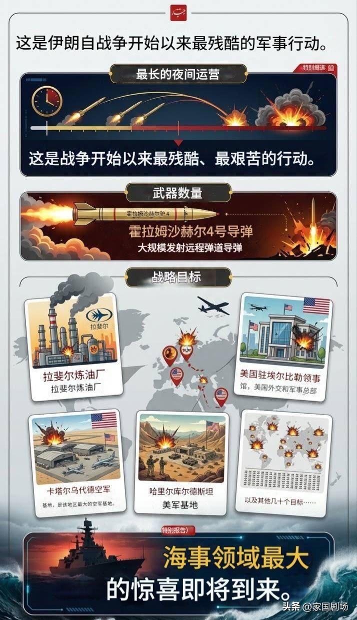 伊朗媒体(通过塔斯尼姆通讯社): “第37波行动,伊朗自战争爆发以来最致命的军事行动 ▪️行动类型:无人机-导弹 ▪️持续时间:3小时 ▪️最常发射的导弹类型:超重型“霍拉姆沙赫尔”导弹 ▪️目标:第二次袭击特拉维夫以南的哈乌拉卫星通信中心,以及位于贝尔雅库布、西圣城和海法的军事中心,此外还包括埃尔比勒和第五海军基地的多个美军目标”。