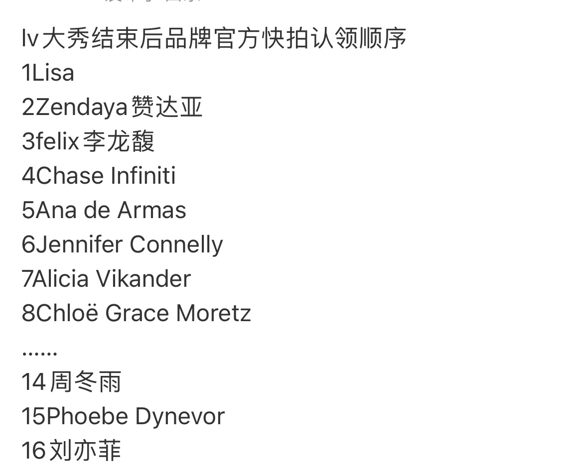 LV大秀外网认领顺序:Lisa第一,赞达亚第二,felix李龙馥第三,周冬雨14,刘亦菲16