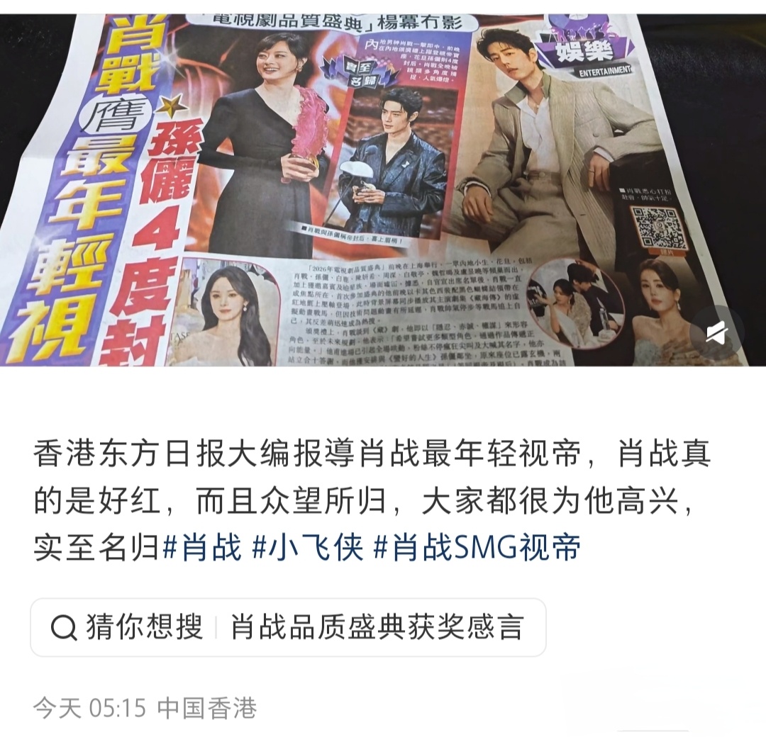 港媒报道肖战最年轻视帝香港东方日报大编报道肖战最年轻视帝!藏海大人实至名归 东方日报报道肖战