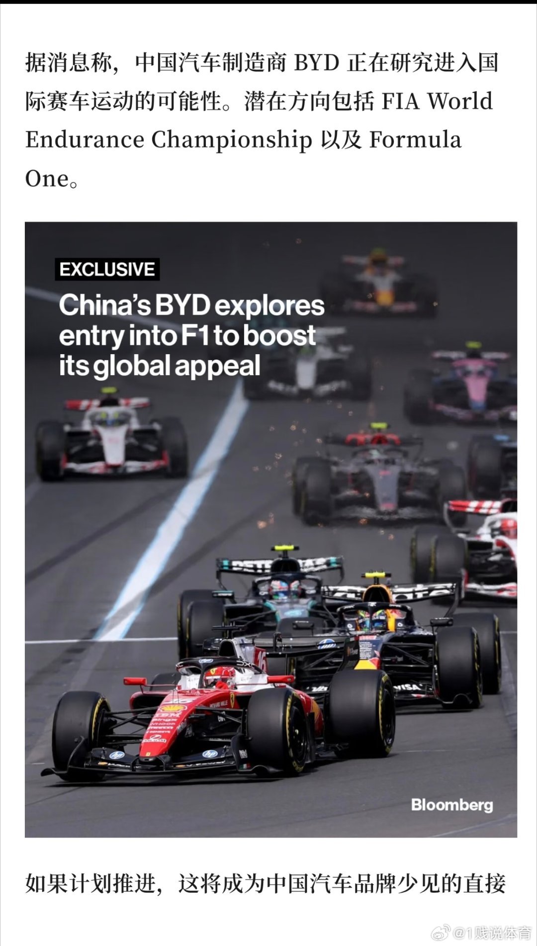 比亚迪或将加入F1等赛事传闻 比亚迪正研究进入国际赛车运动,可能参与FIA世界耐力锦标赛和Formula One,参与这种赛事有助于提升品牌影响力和技术展示,个人强烈支持中国企业出海,或者是让比逐渐的亚迪走向高端化。因为看f1中产比较多而且外国人也多非常适合中国车企进入。F1中国大奖赛