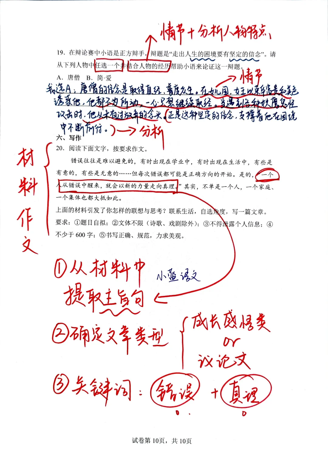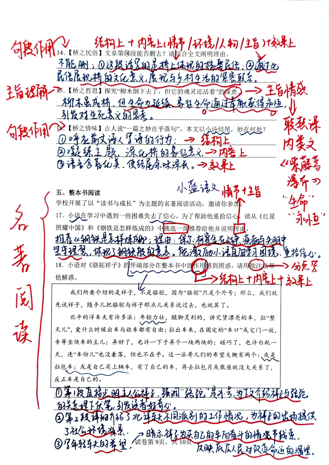 [一R]名著阅读题量较大,共3道问答题,考查了《红星照耀中国》《钢铁是怎样炼成的》《骆驼祥子》《西游记》《简·爱》共五本名著,每一本名著的主要人物、主要情节、主旨情感一定要在考前背诵得滚瓜烂熟,且要圈画题目中的关键词,分析题目的要求再进行作答。