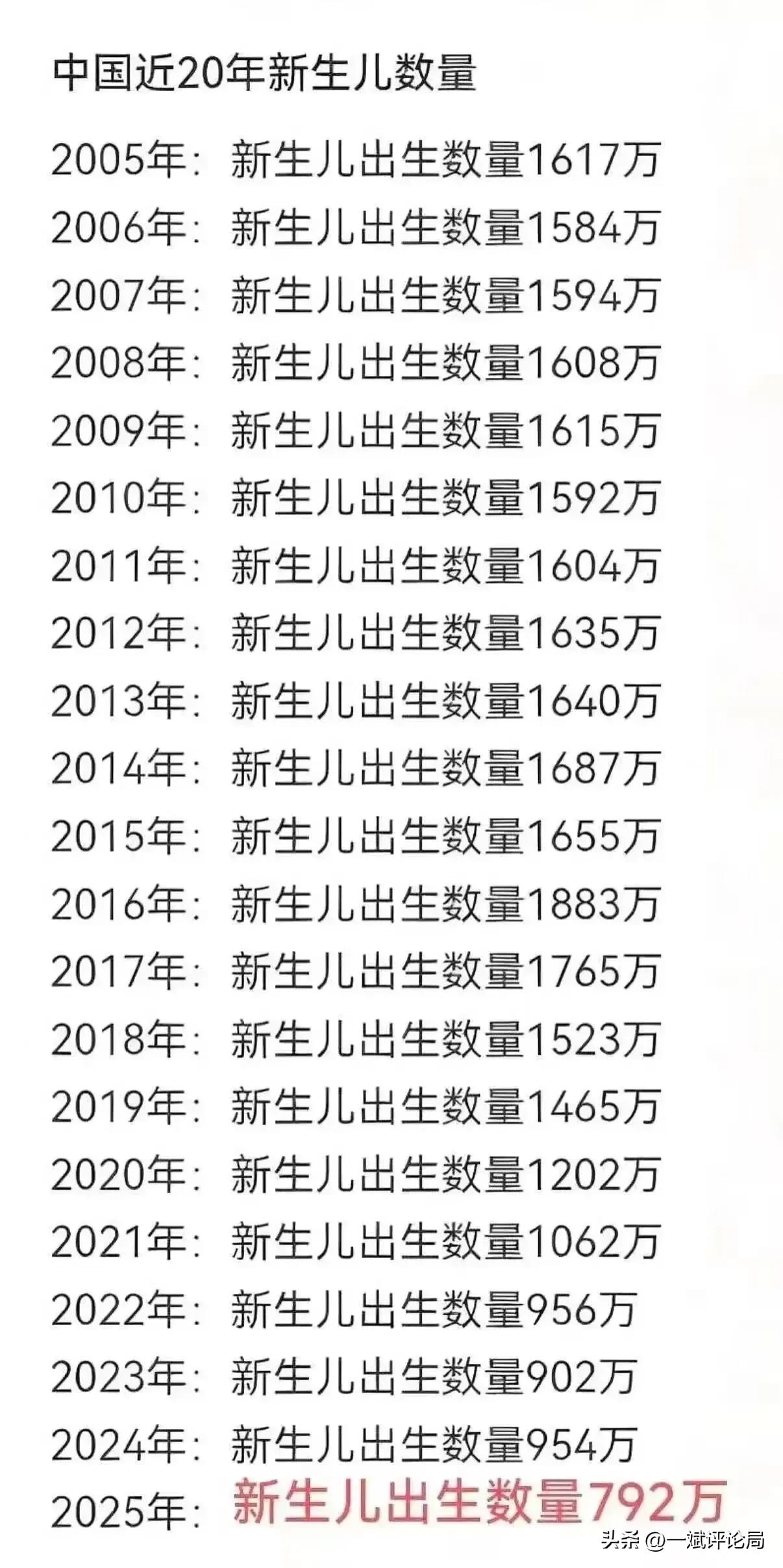 近20年来,中国新生儿出生高峰有两个高峰:2014年和2016年。从2018年开始,新生儿出生数量呈大幅下降趋势。这一年,也是中美贸易战开始。新冠疫情3年多,大家有更充裕的时间“窝”在家里,新生儿数字竟然没有一点上升,还在逐年下降。是经济条件不好,还是生育观念转变的因素说不清楚。若是前者,60后、70后这两代人出生的那些年,国家经济并不好,而生育率奇高,兄弟、姊妹7个、8个不稀奇。今天生活再难与50年前比较也是神仙般日子。 有数据表明,1960-70年代,中国育龄妇女总数在1.3亿至1.6亿左右。而截止到2025年,中国15-49岁的育龄妇女总数为3亿人 。所以,育龄妇女基数不是出生率的决定性因素。 个人认为,中国新生儿数量不断减少,生育观念并不是一个主要因素,而是因为我们自己的生活要求太高了!“多子多福”、“传宗接代”等传统观念,暂时被搁置,也许将来有一天还会被继续传承。