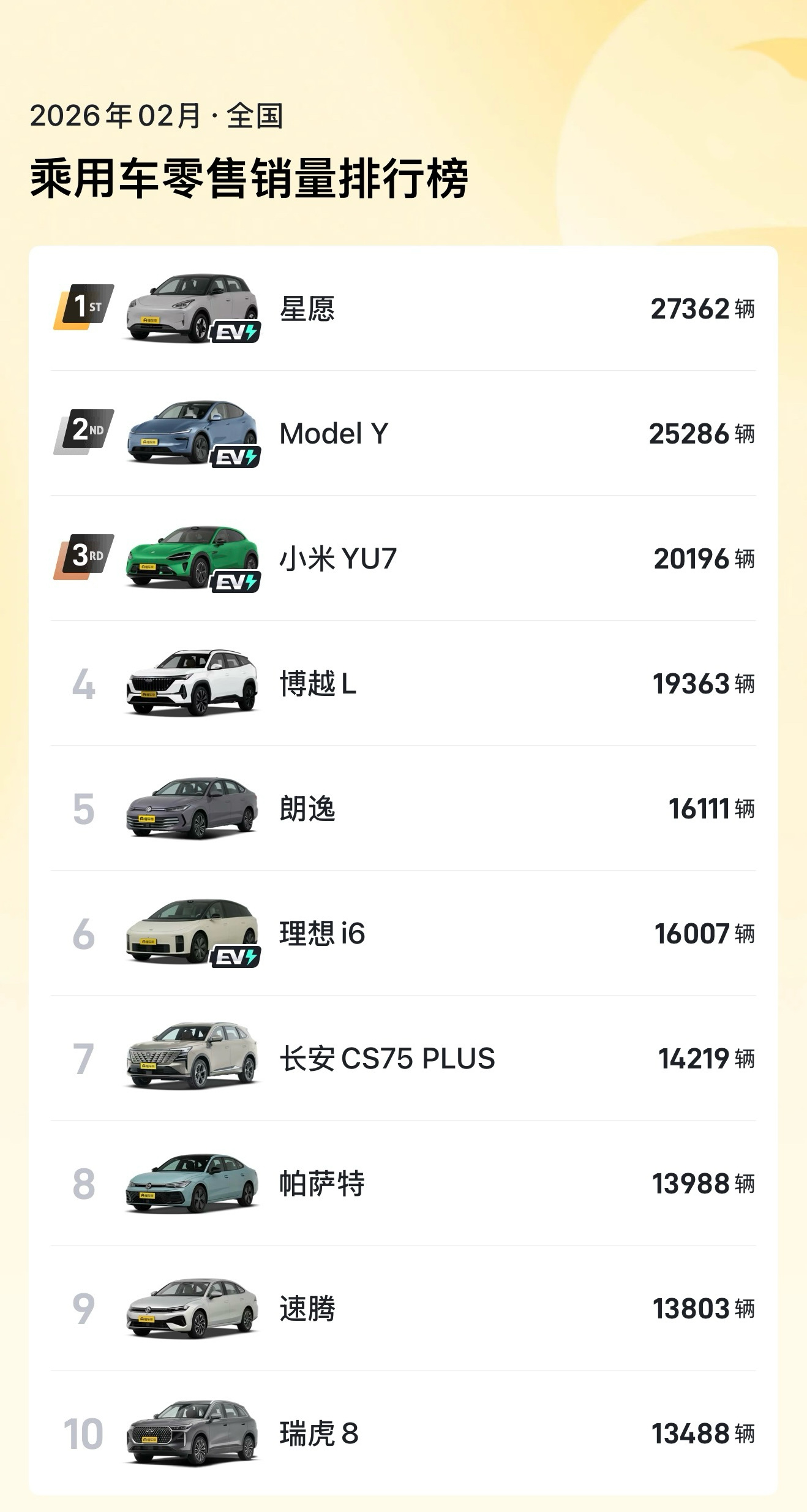 2026年02月全国乘用车零售销量排行榜Model Y和小米YU7有点强大,销量