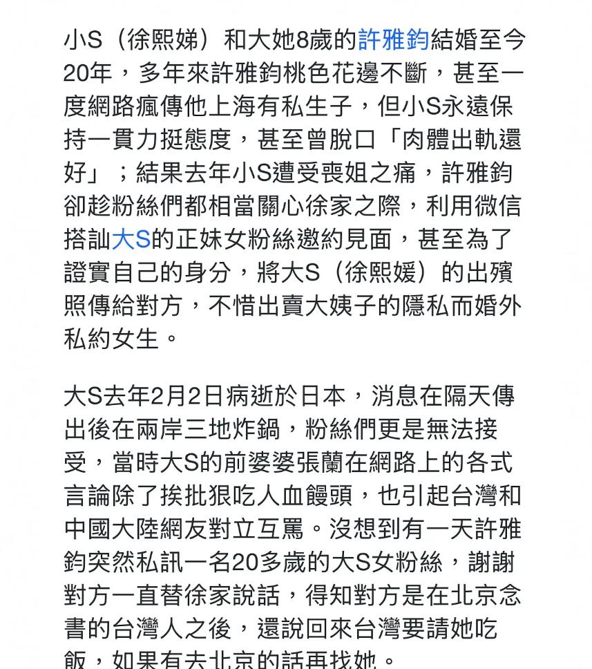 s妈,小s,光头,都三番五次的上了热搜了 这次换成了小s的老公许雅钧,他居然把大s的出殡照发给的大s的粉丝,而且还私联人家粉丝 我想起来之前刷到有小S粉丝说看到大S出殡还是立雕塑现场许一直陪伴,感慨夫妻感情外人不懂,说小S说的幸福就是真的。 感觉很荒谬,甚至怀疑粉丝是因为对比汪小菲,而故意夸许 现在明白了,说什么姐妹情深啊,都是假的,老公都做到这个地步了,小s还能忍 说小S,为钱?即使现在不如以前火,跑个商演,做个自制节目,也还是有人买账吧。为感情…图他啥?出轨成瘾?屡次家暴传闻 就是怕离婚会分财产吧。不离婚,至少这男的噶了,钱还能分给她三个女儿。要是离了,没准小S的钱都会被这男的分走一部分