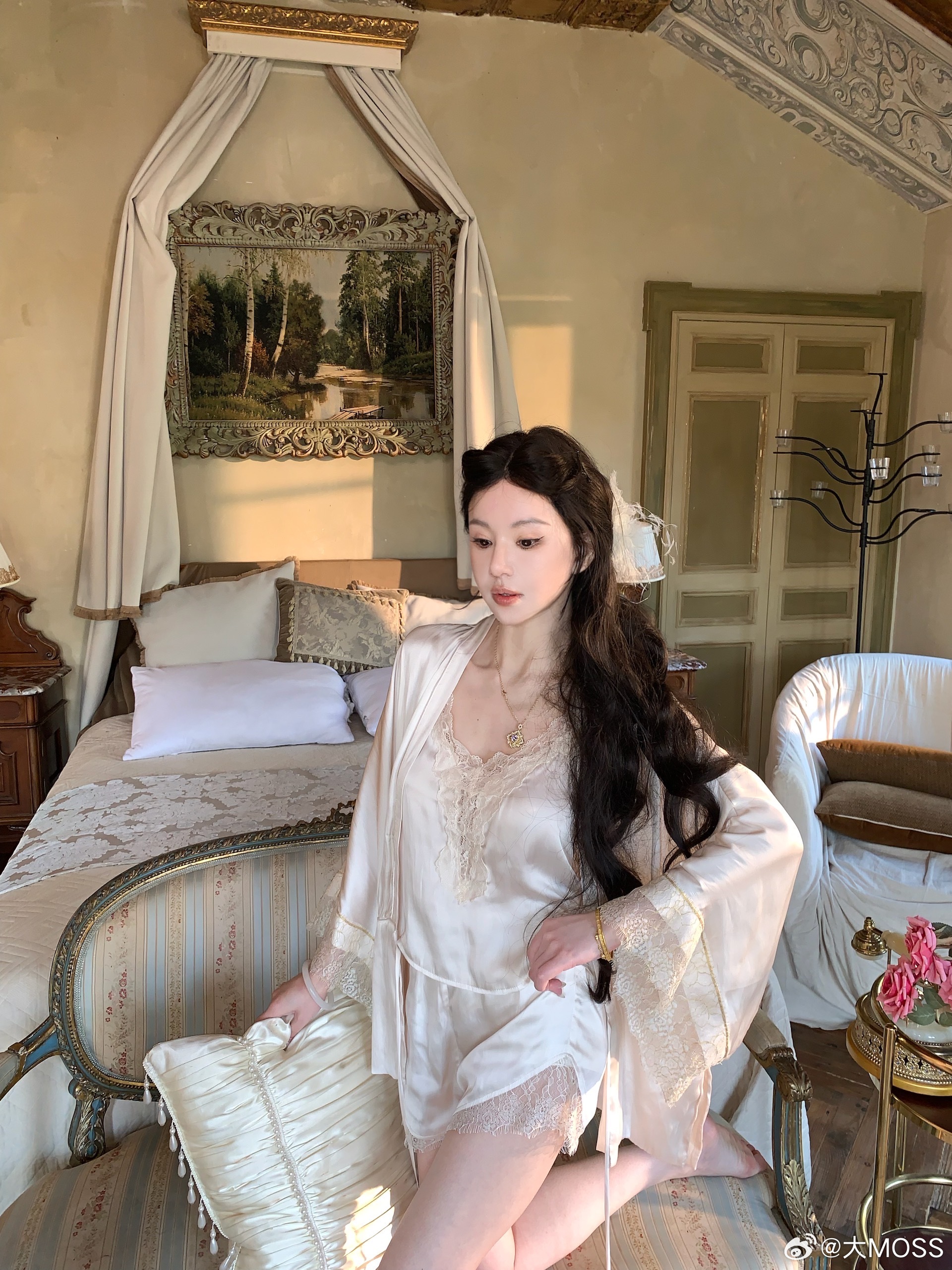 𝑴𝑶𝑺𝑺 𝟑.𝟏𝟓/𝟐𝟎:𝟎𝟎𝒑𝒎【醉梦思华容】🌉✨这是一套融合了新中式美学与法式浪漫的四件套睡衣,包含蕾丝吊带、系带睡袍、阔腿长裤和蕾丝短裤,可随心组合穿搭✨新中式