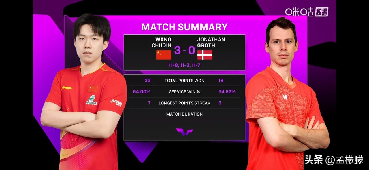 男单1/16决赛 王楚钦(CHN)3-0约纳坦·格罗特(DEN)【11-8,11