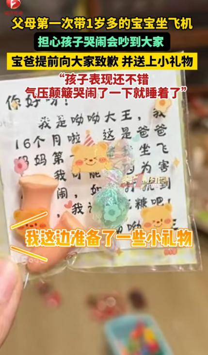 “这才是大智慧!”近日,浙江杭州,一对夫妻第一次带小孩坐飞机,担心在飞行过程中孩子哭闹,影响到其他乘客,爸爸便提前向乘客致歉,并且还准备了小礼物发给众人,希望乘客们能够包容一下!网友:这样的家长太棒了! 为人父母者,大抵都懂带幼童出行的窘迫与忐忑,尤其是第一次乘坐飞机,更是一场充满未知的“挑战”。 对于懵懂无知的小宝宝而言,机舱是一个完全陌生的空间——封闭的环境、持续的引擎轰鸣、上升下降时的变化,还有长时间无法自由活动的束缚,每一样都可能成为他们哭闹的原因。 而飞机舱内空间有限,孩童的哭声穿透力极强,一旦响起,难免会打破机舱的宁静,影响到身边每一位乘客的出行体验。 这份“怕打扰别人”的顾虑,成了很多带娃家长出行时最沉重的心理负担,既心疼孩子可能承受的不适,又愧疚于可能给他人带来的困扰。 杭州这对夫妻,他们的宝宝尚不足两岁,从未有过乘坐飞机的经历。 距离出行还有数日,夫妻俩便开始辗转反侧,反复琢磨着如何能最大限度减少对其他乘客的影响。 他们翻遍了各类育儿论坛,发帖向有经验的家长求助。 有人建议准备孩子喜爱的玩具与绘本转移注意力,有人支招提前喂饱哄睡、让孩子在飞行中度过大部分时间,还有人提醒他们,真诚的沟通远比被动道歉更有效。 综合了所有建议,夫妻俩做出了一个让人暖心的决定:除了备齐孩子的奶粉、尿不湿、安抚玩具等一应物品,还要为同舱的每一位乘客准备一份小礼物,提前主动致歉,用最真挚的态度,换取大家的理解与包容。 走进机舱,乘客们整理行李、系安全带的声音交织在一起。 安顿妥当后,爸爸没有丝毫停歇,从随身的背包里拿出一个提前准备好的帆布包,里面整整齐齐地装着一份份小巧的礼物。 他轻轻将孩子托付给身边的妈妈,示意她好好安抚,随后便弯腰起身,从紧邻的乘客开始,一一递上礼物,眉眼间满是温和的笑意,语气诚恳得让人动容。 “您好,实在不好意思打扰您。这是我们孩子第一次带孩子坐飞机,我们特别担心他等会儿会因为害怕、不适哭闹,影响到您的休息。这份小礼物您收下,若是真的打扰到您,还请您多担待、多包容,麻烦您了。” 每递出一份礼物,他都会认真地重复这段话,没有丝毫敷衍,每一个字里都藏着愧疚与真诚。 起初,不少乘客都愣了一下,显然没料到会遇到这样的情况——乘坐飞机多年,见过因孩子哭闹引发的争执,见过家长的无奈与尴尬,却很少有人会因为“担心打扰别人”,提前主动道歉、送上礼物。 短暂的错愕之后,乘客们纷纷露出了温柔的笑容。 而整个飞行过程中,或许是感受到了周围的善意,或许是爸爸妈妈的安抚足够安心,小宝宝醒来后并没有哭闹,只是睁着圆溜溜的大眼睛,好奇地打量着身边的一切,偶尔发出一两声软软的咿呀声。 唯一的一次哭闹是因为颠簸,但由于家长在全力的哄着,不一会儿,小宝宝便又沉沉睡去。 这暖心的一幕,被同舱一位乘客悄悄用手机记录下来,发布到了网上。 视频中,爸爸递礼物、真诚道歉的模样,乘客们友善回应的笑容,都被清晰地定格下来。 视频的评论区里也满是赞誉,网友们纷纷留言:“这样的家长,真的太赞了!” 还有网友感慨道:“一份真诚,胜过千言万语,被狠狠暖到了。” 还有不少网友分享自己的经历,说曾经坐飞机时,遇到过孩子哭闹不止,家长却视而不见、只顾自己玩手机的情况,那种烦躁与无奈,至今记忆犹新。 而看到这对夫妻的做法,他才真正明白,或许人们在意的从来不是孩子偶尔的哭闹,而是家长的态度——是只顾自己、理所当然,还是换位思考、真诚体谅。 (信息来源:AHTV第一时间《父母第一次带1岁多的宝宝坐飞机,担心孩子哭闹会吵到大家,宝爸提前向大家致歉并送上小礼物,“孩子表现还不错,气压颠簸哭闹了一下就睡着了”。》)