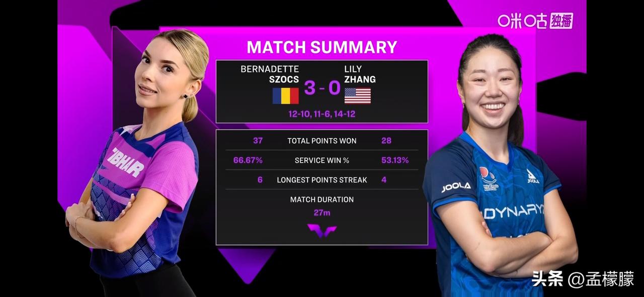 女单1/16决赛: 伯纳黛特·斯佐科斯(ROU)3-0张安(USA)【12-10,11-6,14-12】 下一轮:陈熠 VS斯佐科斯 乒乓重庆冠军赛 重庆乒乓冠军赛