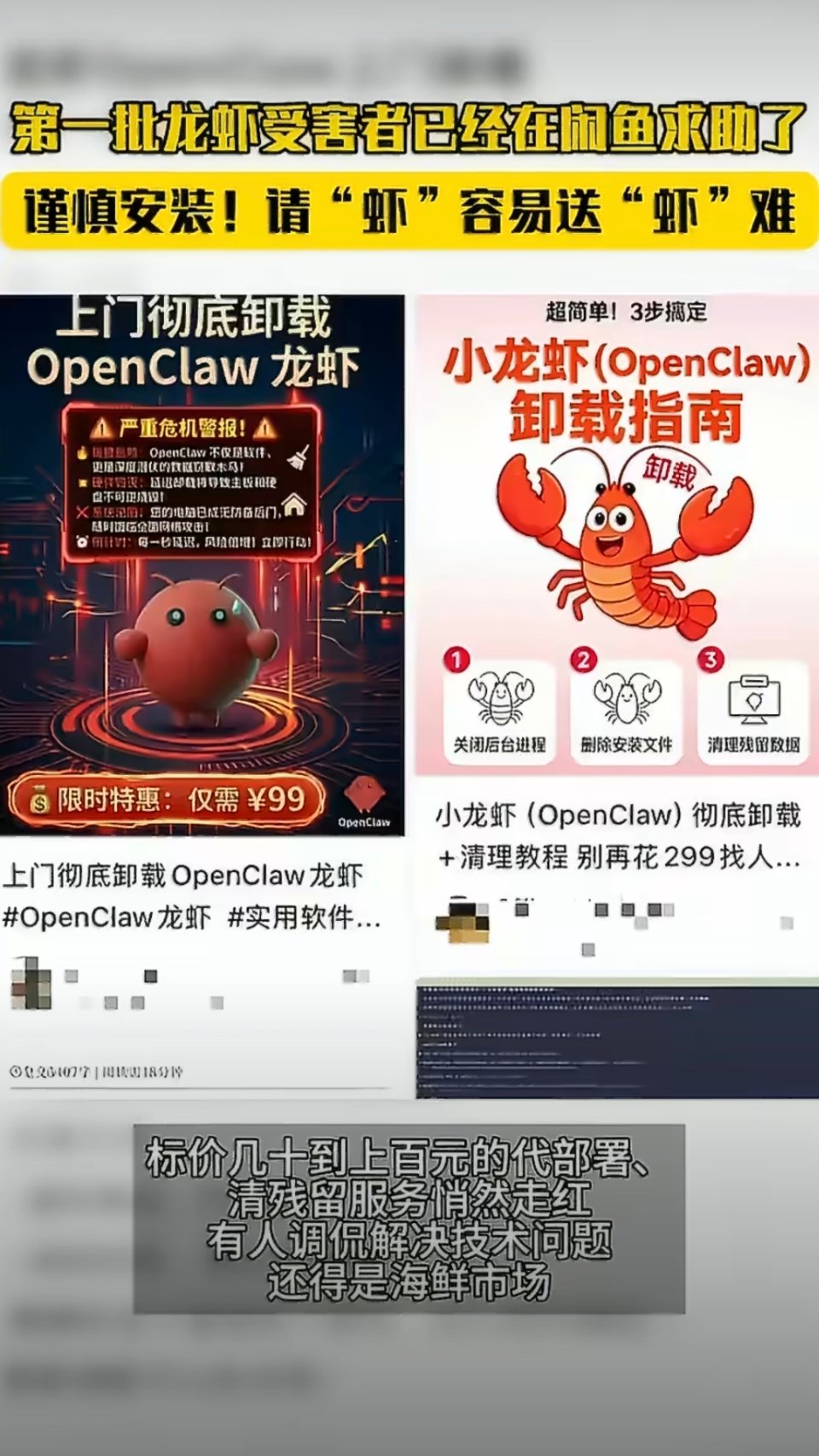 第一批龙虾受害者已经在闲鱼求助了 都不知道自己这几天在这折腾什么,前几天兴高采烈的下载龙虾,现在又求爷爷告奶奶的在闲鱼摇人来上门卸载龙虾,幸好上门的人还是靠谱的,帮我解决了这个问题,感慨呀!