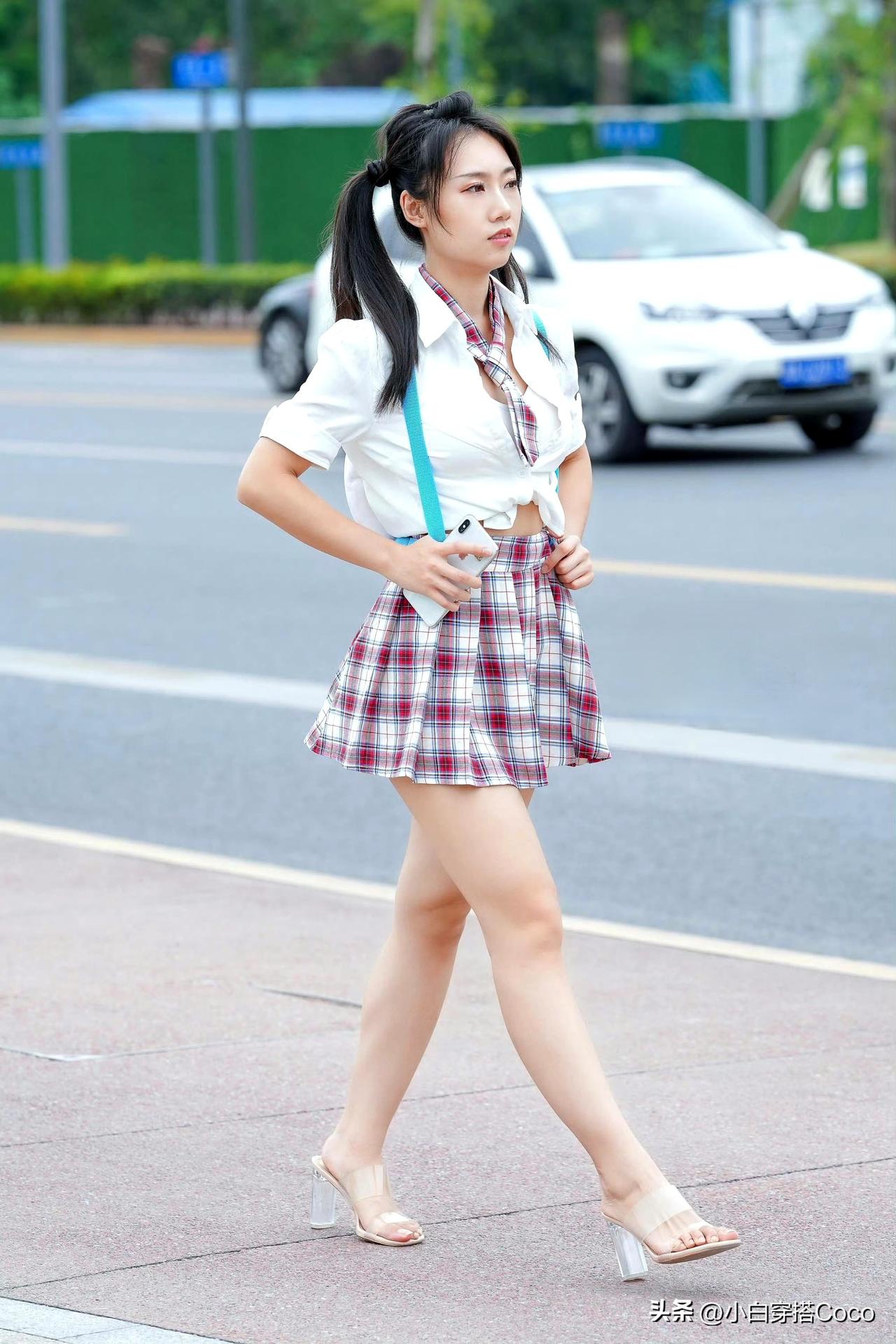 今日穿搭分享 今天穿搭记录 今天穿搭思路 女生穿白衬衫街拍,有哪些时尚搭配 干净白衬衫+红格百褶裙,日系JK感穿搭太减龄了!把“少女感”和“小性感”平衡得刚刚好!短款白衬衫露出腰线,红格裙青春活力,透明跟凉鞋中和了甜腻,又甜又飒,是让人一眼记住的街头少女感穿搭。