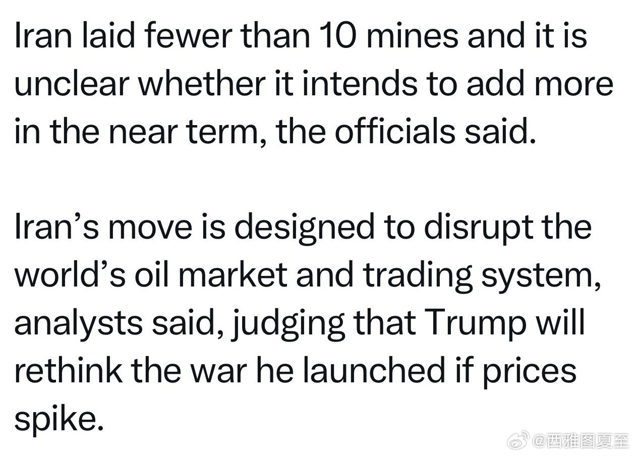美国媒体多方证实:伊朗已在霍尔木兹海峡布雷,试图扰乱原油市场和交易系统,以此施压Trump停战