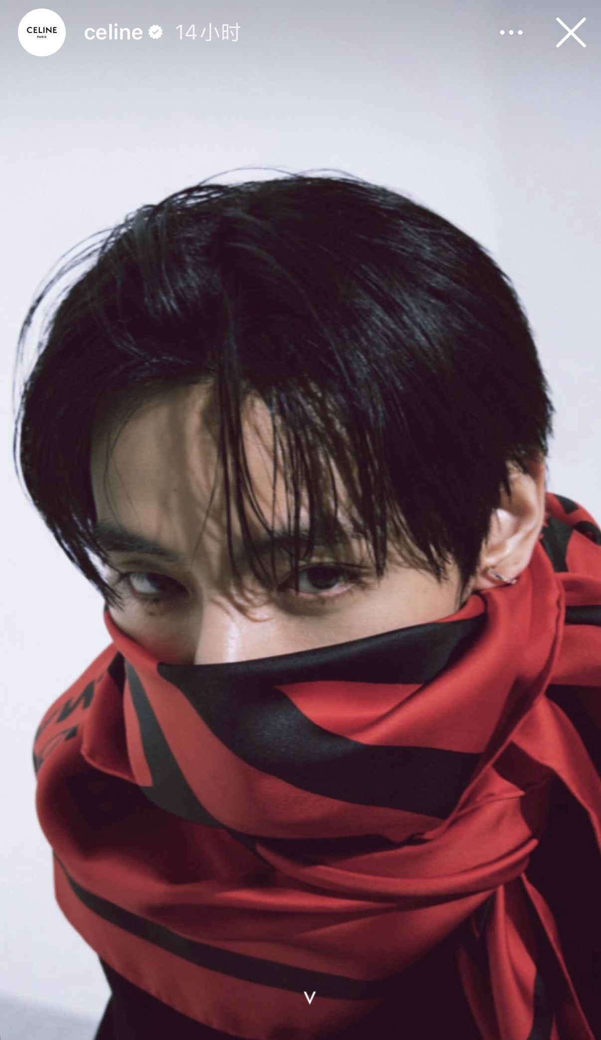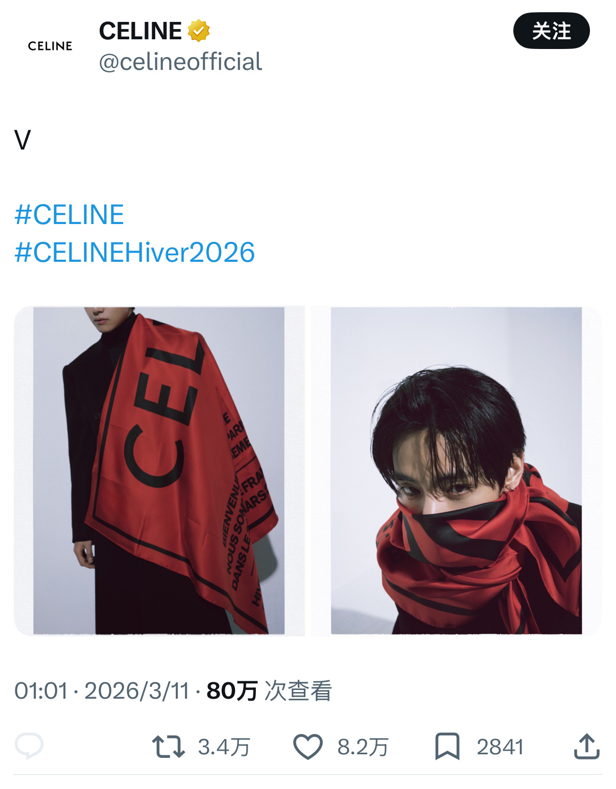 虽然V因行程没到巴黎现场,但拍摄一组大片为品牌大秀预热,秀后品牌在IG & X 两大社交平台认领宣传,全程参与的即视感,这大概就是影响力