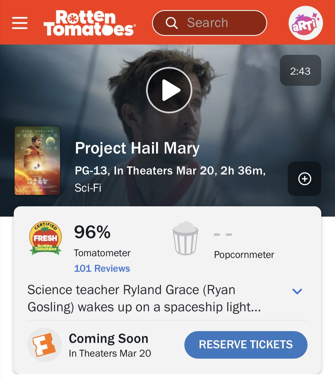 电影挽救计划 在烂番茄网站上的新鲜度认证为 96%!本片将于3月20日全国公映。
