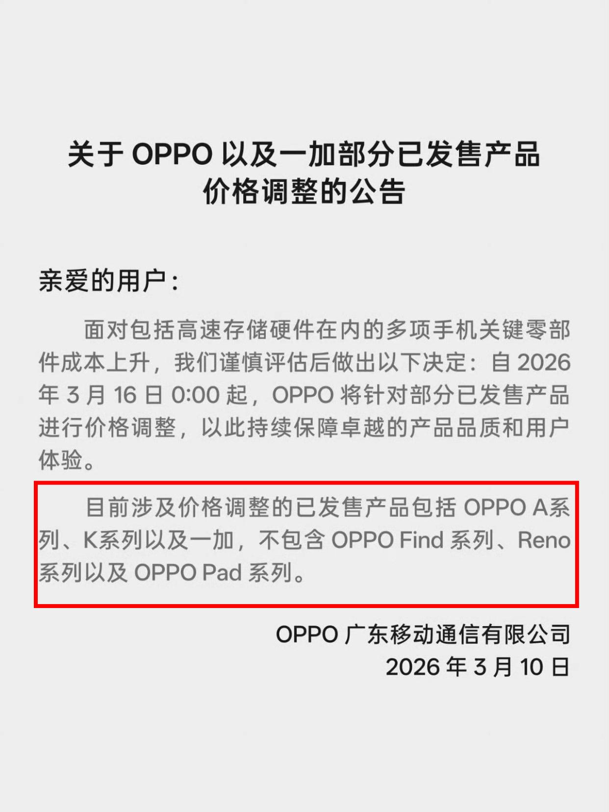 2026各大厂集体涨价!谁更良心一目了然 真不是危言耸听,前几年各家都在卷的时候,2-3k就能买性价比水桶机用个好几年,现在这种好日子也是过去咯...... 受到内存涨价的影响,手机厂商们要开始勒紧裤腰带了,头部品牌砍掉一堆千元机订单,有的小品牌甚至直接取消新机计划,中高端旗舰市场也是涨价的涨价,减配的减配,真是没招了 目前OPPO已经站出来宣布调价了,3月16日起实行,OPPO和一加部分产品线价格上调,也算是厚道了,提前给用户一个缓冲,留足窗口期。就怕某些厂商啥也不说,偷偷调价,打人一个措手不及。而且OPPO自家的旗舰系列是稳住了,没有涨,算是很良心了 只能说今年想换手机的,尽早吧,后面估计越涨越夸张,想买OPPO的赶紧在3月16之前冲了,还有原价,OPPO这波已经给其它厂商打了个样了,不知道后续哪家会跟上?