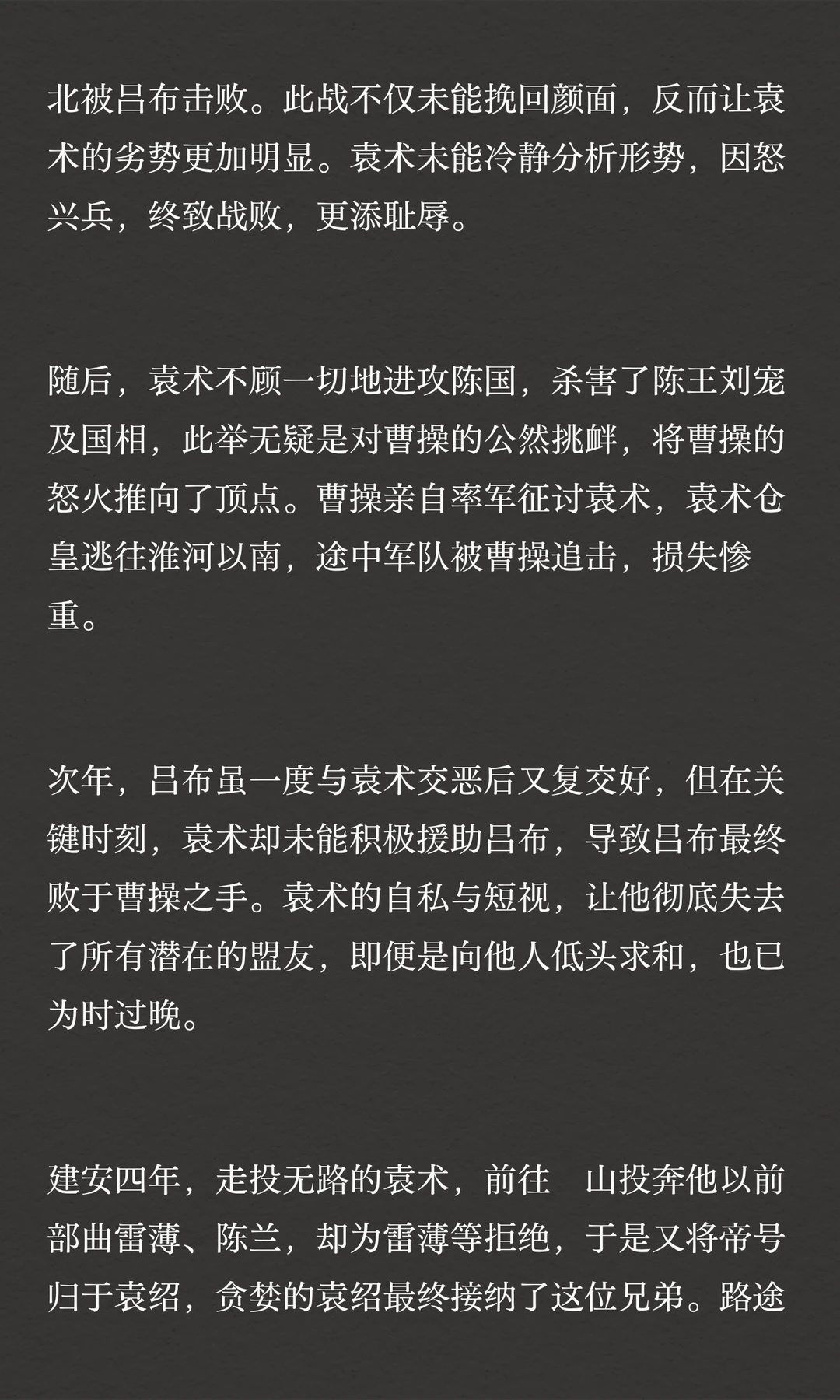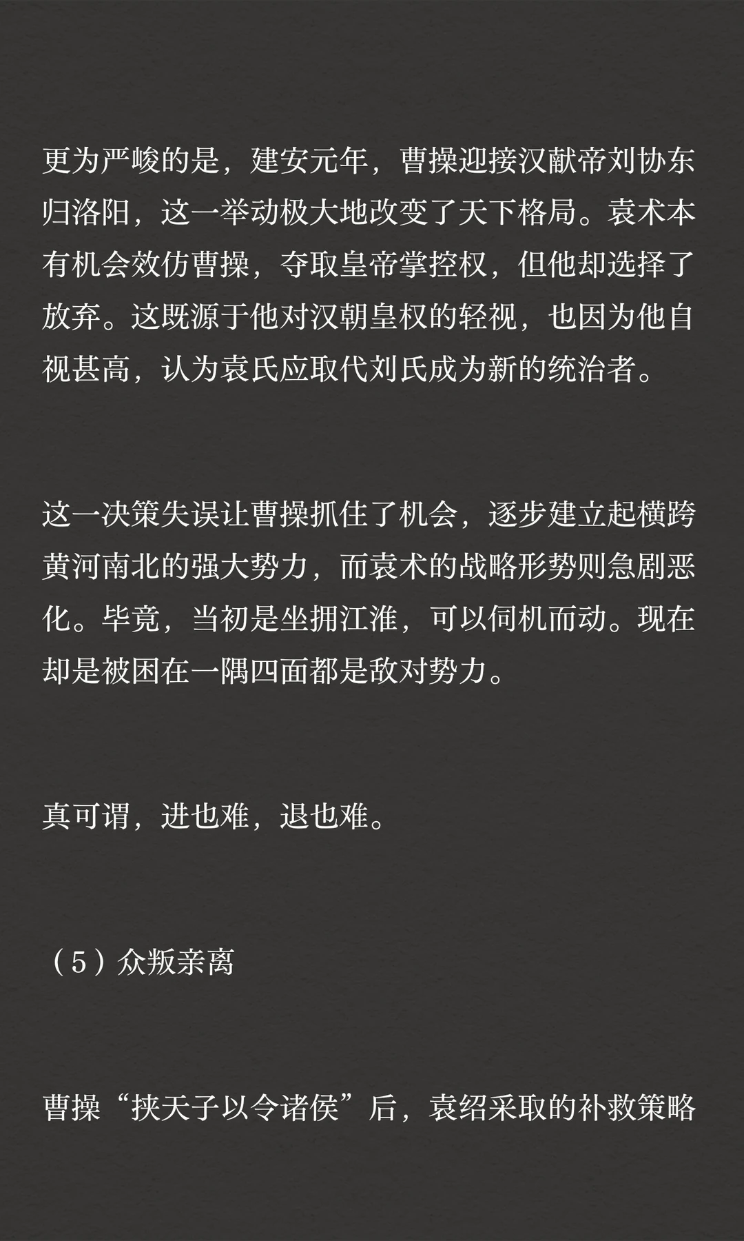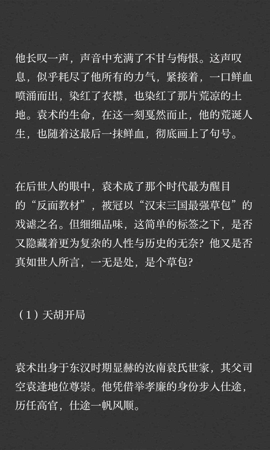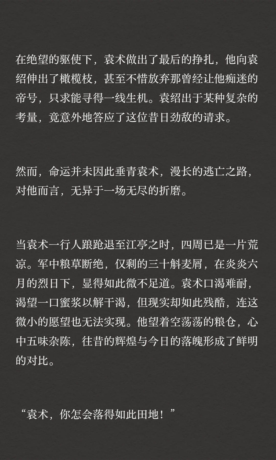 袁术从东汉世家公子跌落,凭借家世和声望在南阳崛起,但因策略失误和内部纷争,最终被曹操击败,众叛亲离,被迫称帝却加剧孤立,最终在逃亡中屈辱而死。