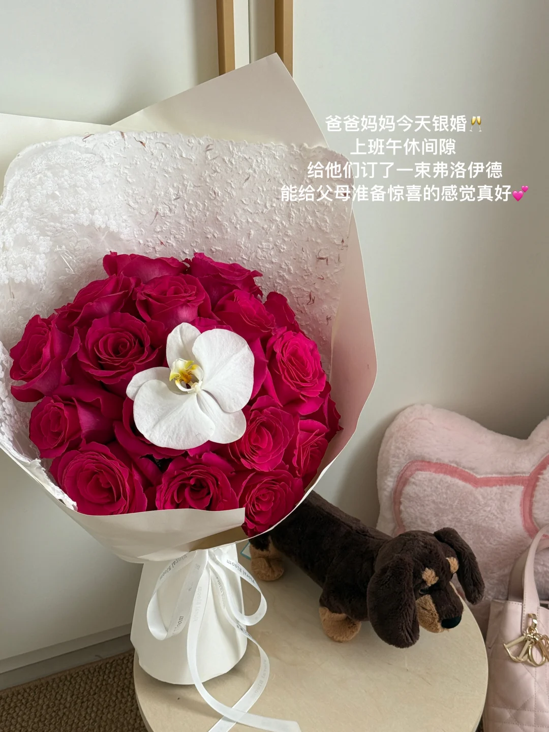 :上班午休间隙,偷偷给爸妈订了弗洛伊德玫瑰,庆祝他们的银婚💐