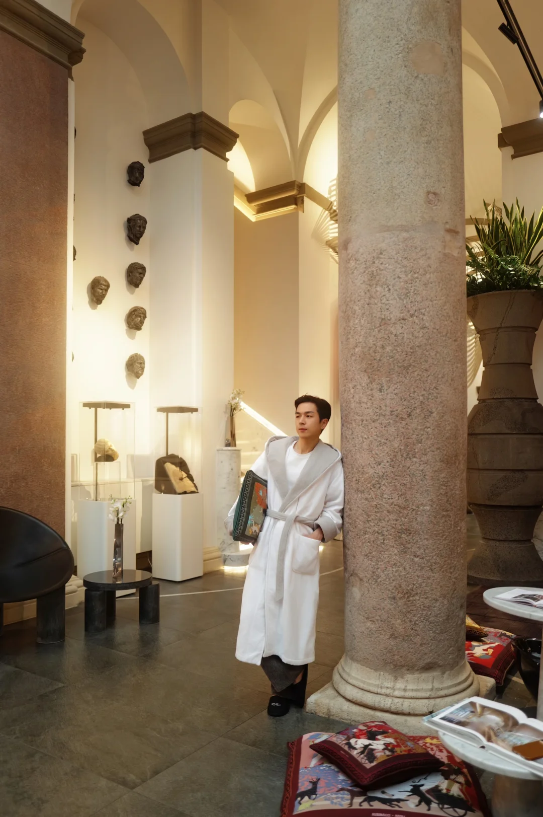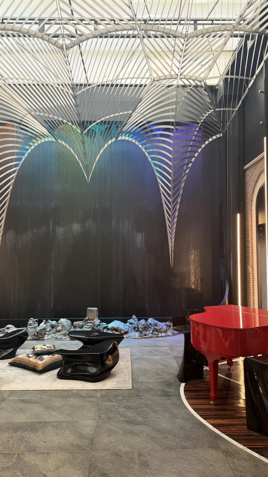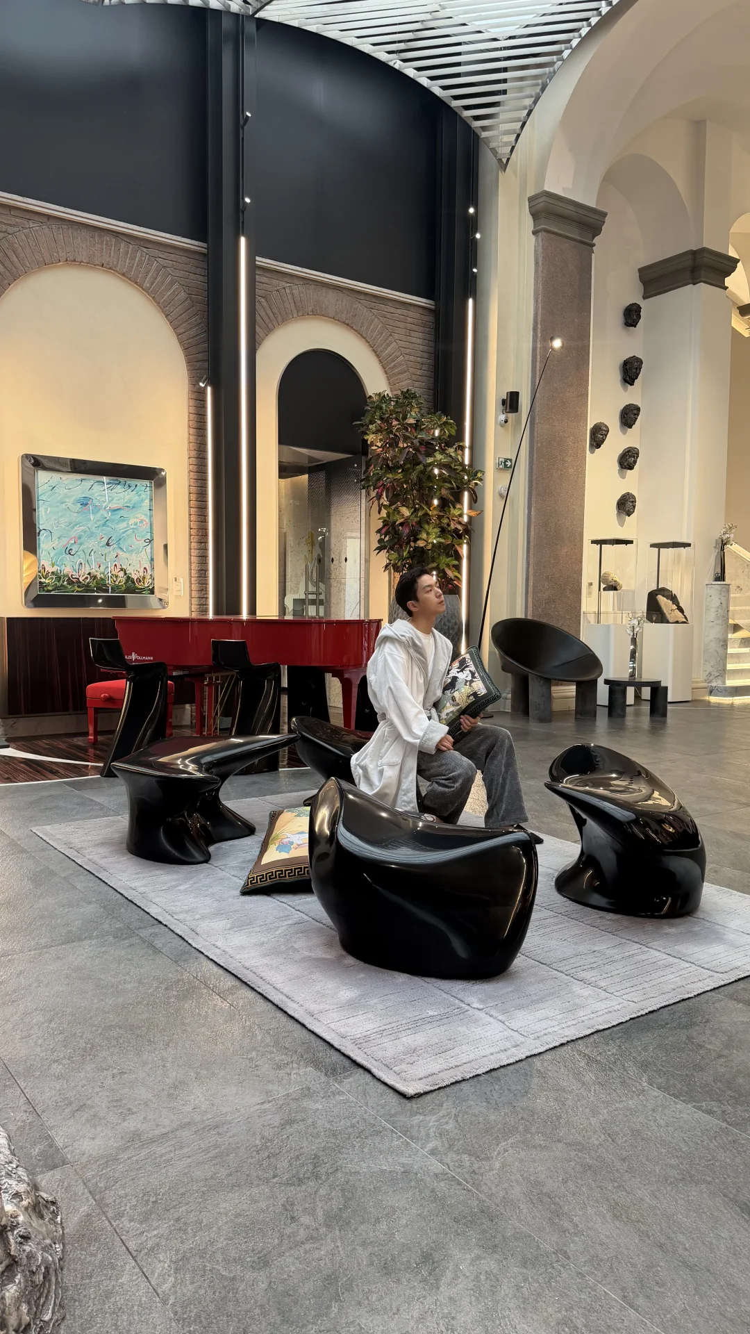我那天坐在大厅的沙发上,看着光线慢慢移动。周围的材质其实很克制,石头、金属、玻璃,但比例被拉得很戏剧化。
