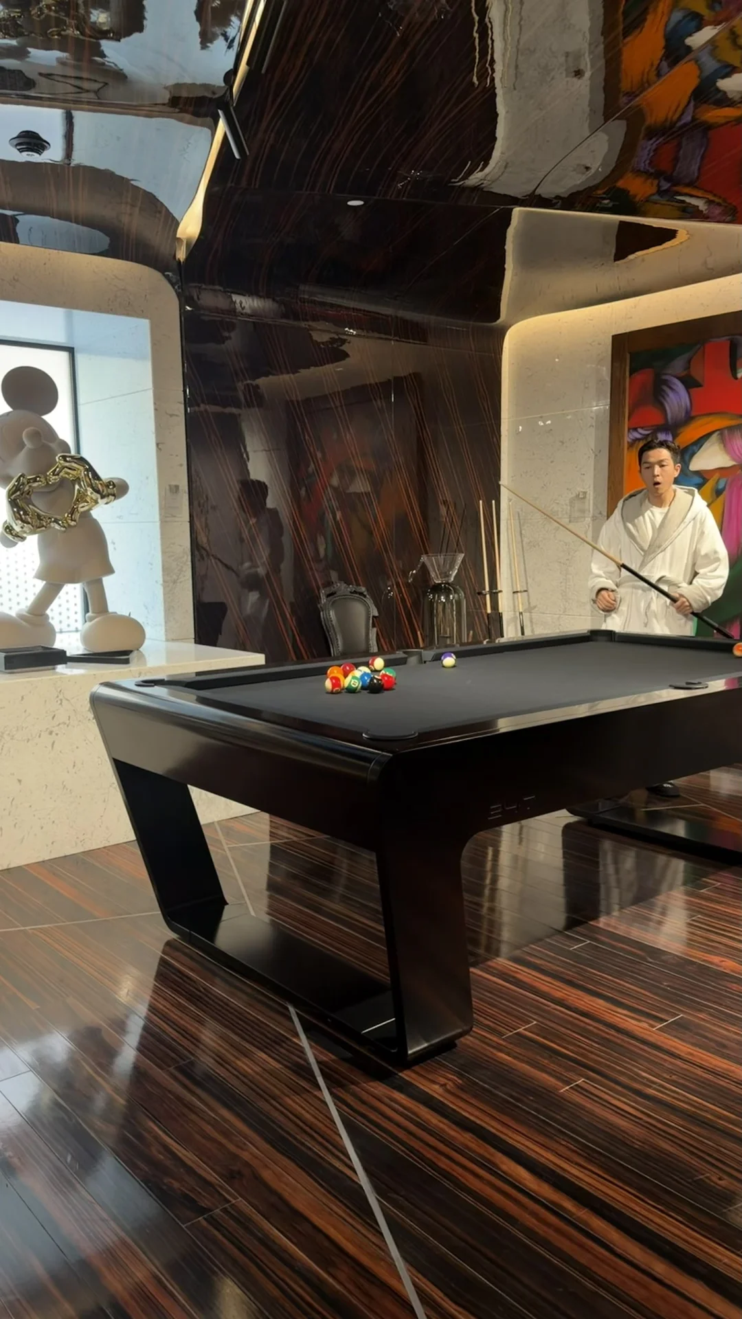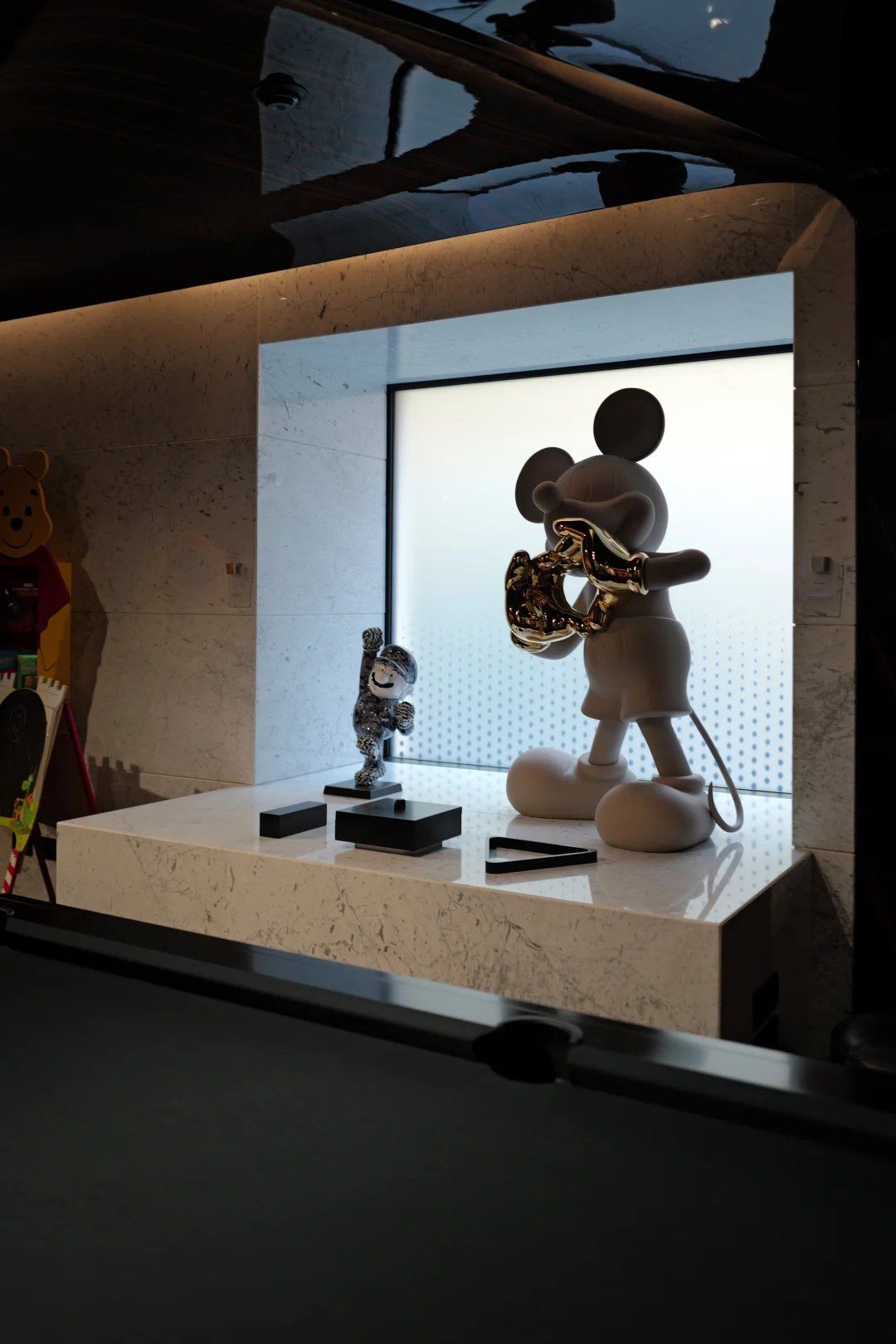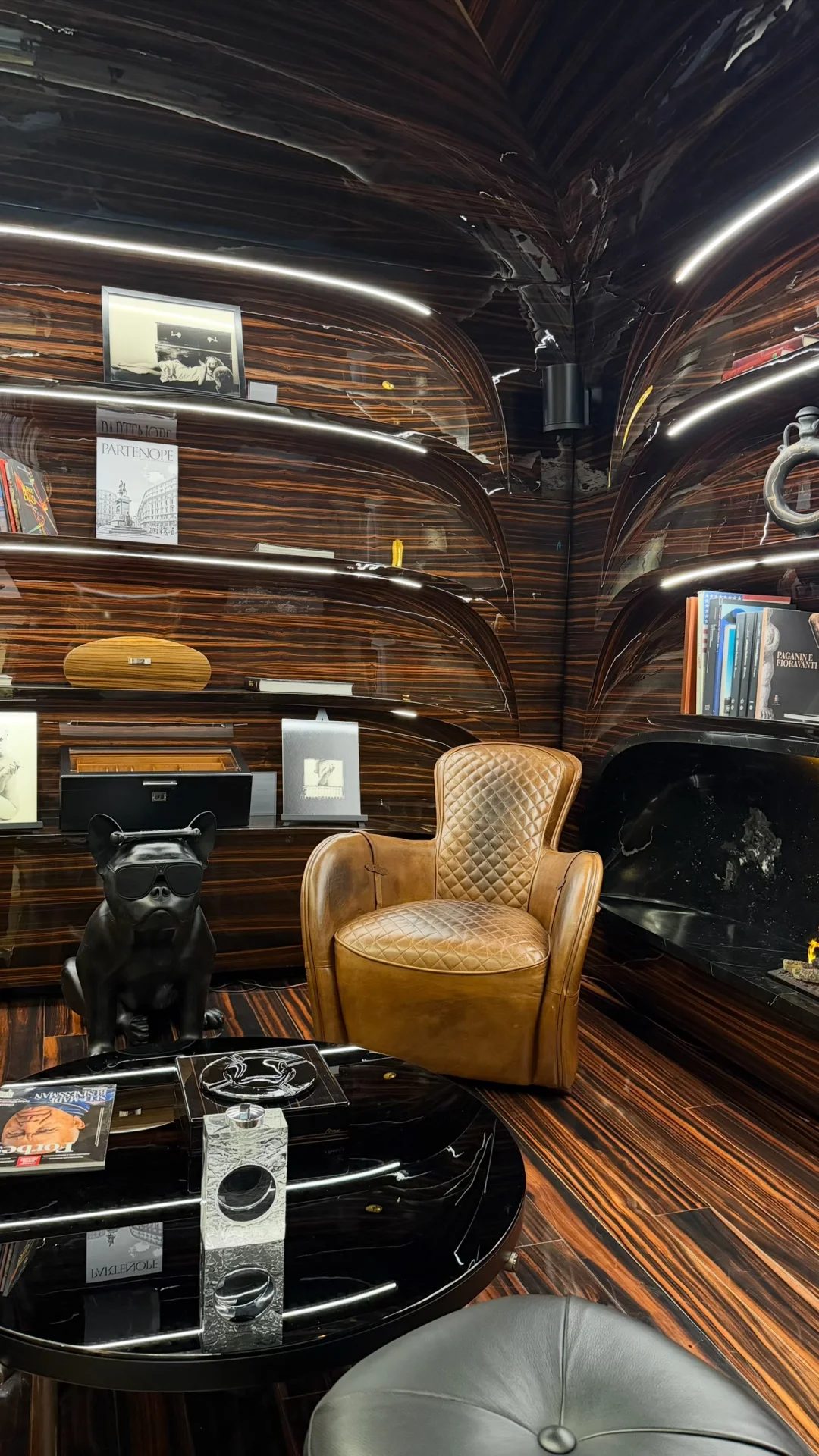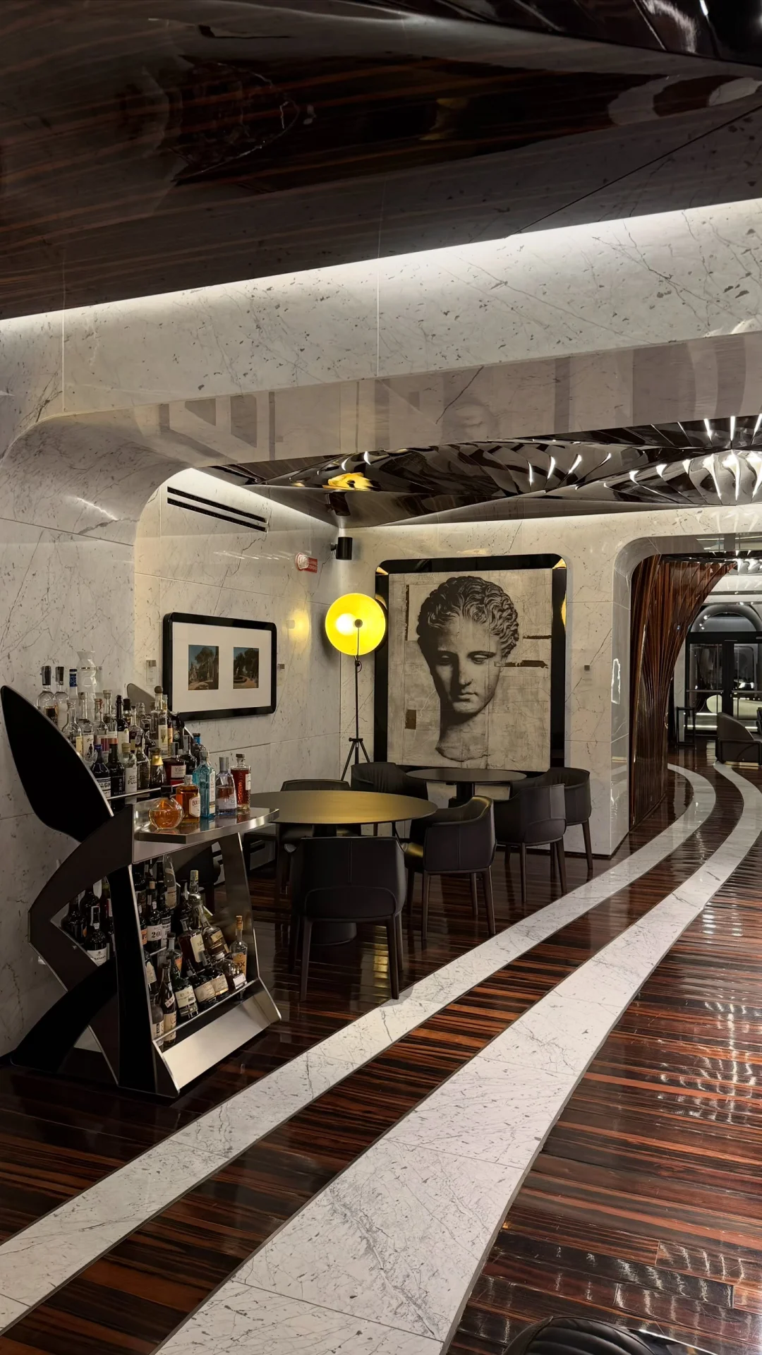 我那天坐在大厅的沙发上,看着光线慢慢移动。周围的材质其实很克制,石头、金属、玻璃,但比例被拉得很戏剧化。