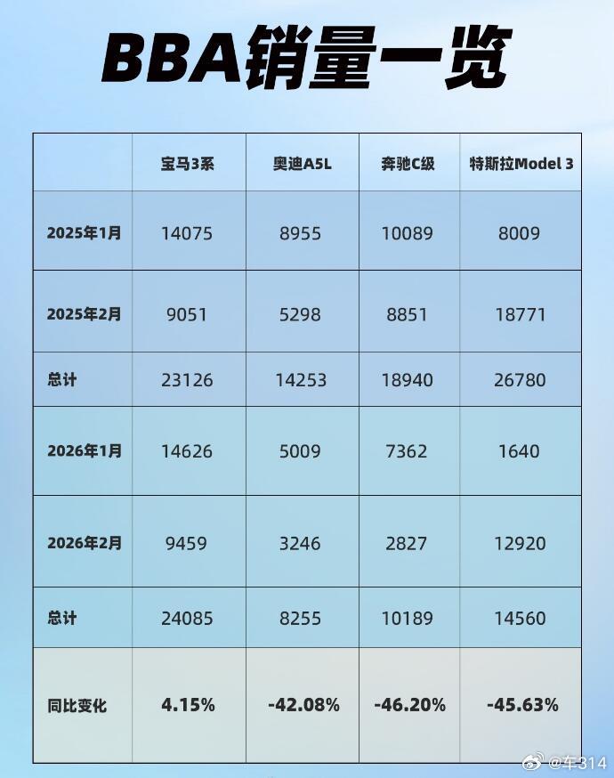 BBA的2月销量也逐渐出炉了,看了一下奔驰C级今年1-2月累计销量下滑46%以上,奥迪A5L下滑42%以上,而宝马3系虽然维持了4.15%的同比增长,但是也非常依赖终端降价来换取销量,宝马5系的降幅则超过30%,这数字显然是不怎么好看的。现在年轻人普遍都喜欢智能化+电动化,就连经历过燃油时代的中年人也更喜欢新能源了。在这方面进展缓慢的BBA就要面临冲击,尤其是燃油车的基本盘出现下滑是肯定的。接下来就看它们怎样调头了,奥迪已经推出了E5和E7X,大众则成立了独自的安徽大众,以及合资的ID.ERA 9X,而奔驰和宝马的动作明显更慢,未来如何还得继续观望!BBA车价大降销量回温难新年BBA大降销售称或是库存车