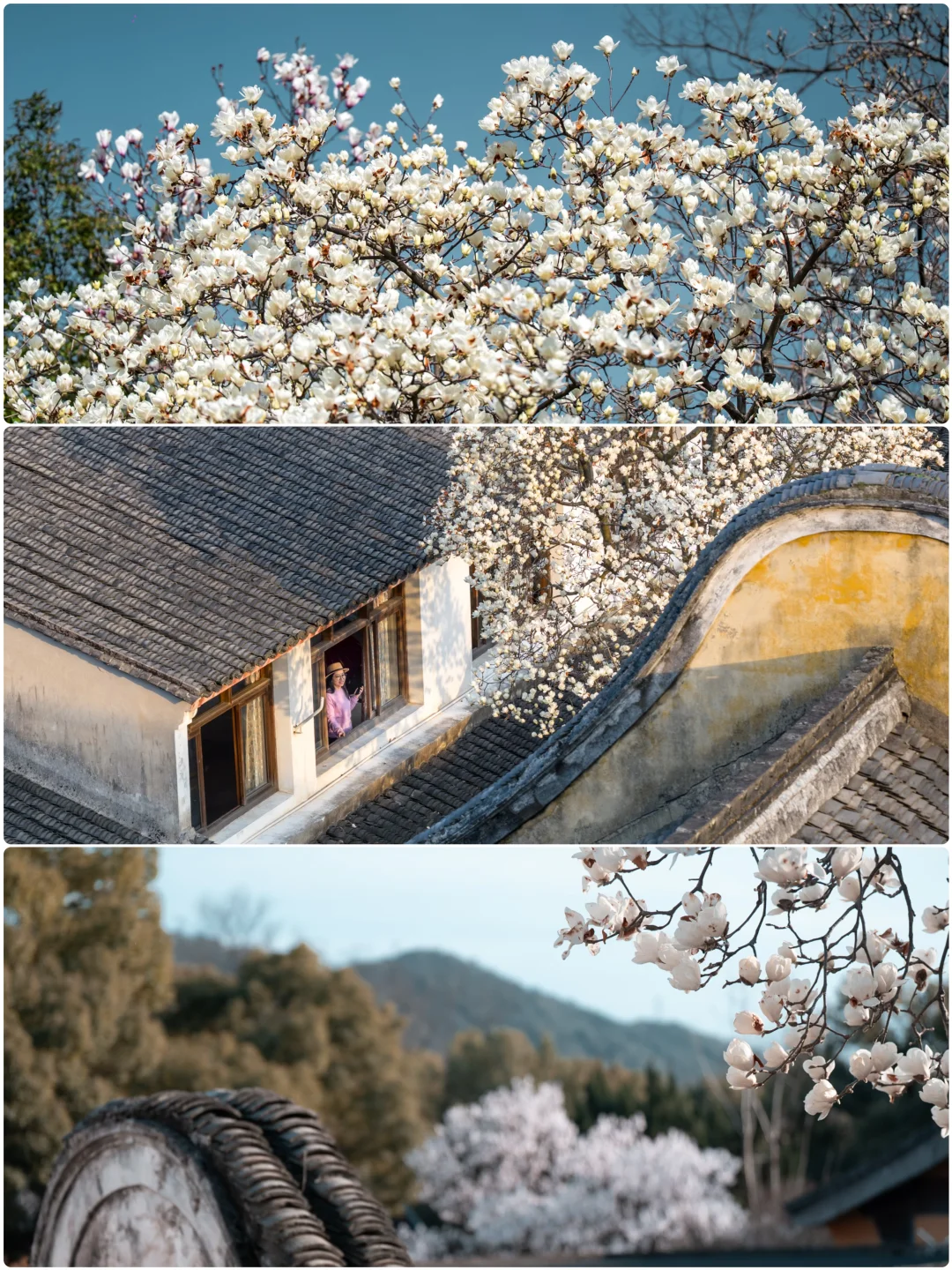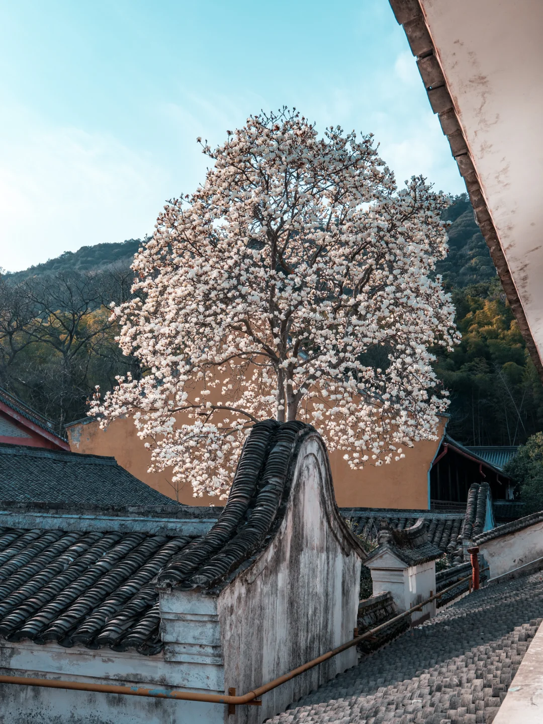 宁波🆙流杏花开了! 玉兰花也还没谢~ 蹲久了就见证了无人版^_^ 一次拍两, 超值‼️ 千年古刹+玉兰花+飞檐黛瓦=洁白又霸气, 杏花+墙黛瓦衬=粉粉嫩嫩。 逛在这里,听听钟声,闻闻花香, 什么烦恼都给你治愈干净。