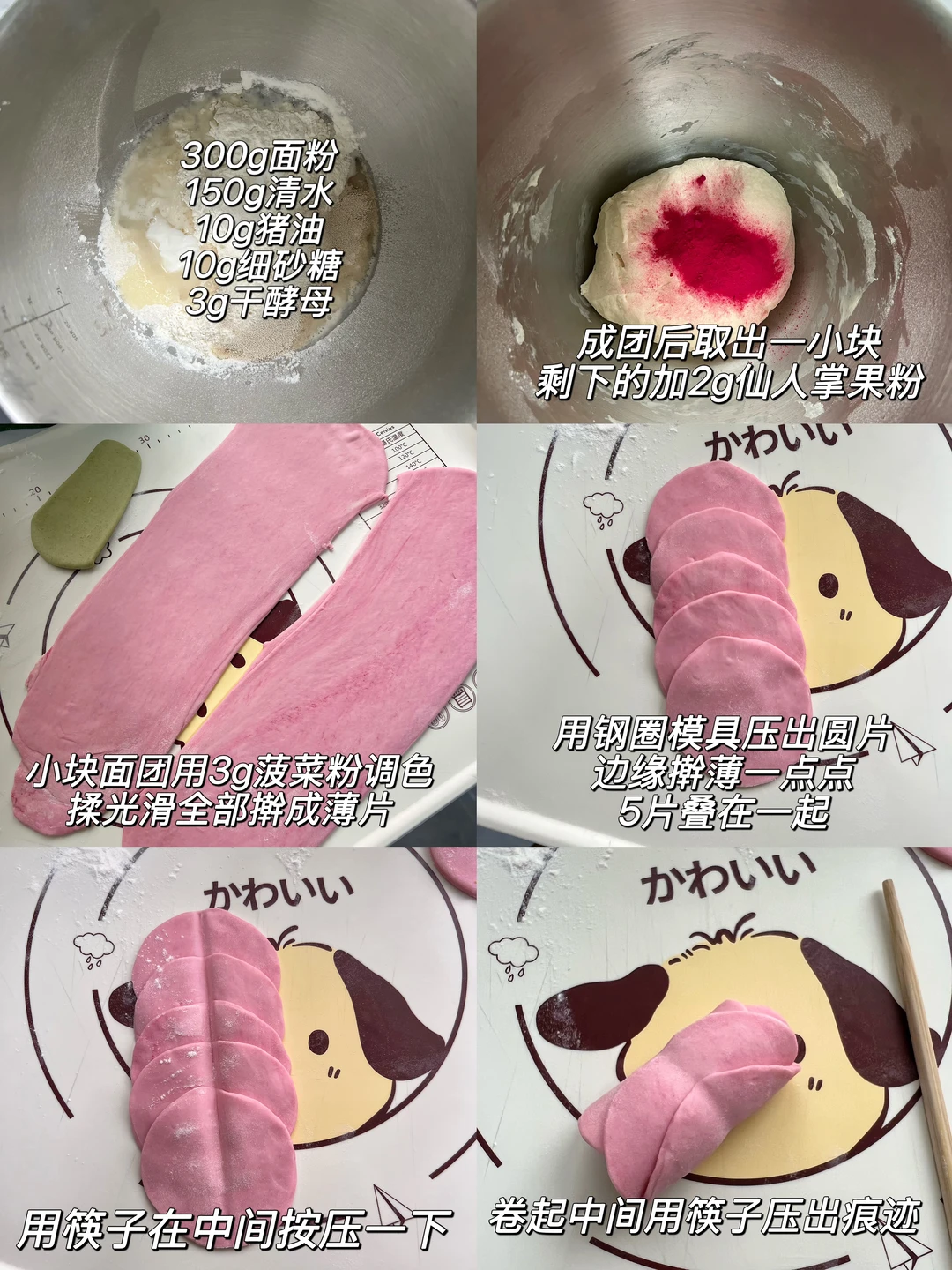 一次发酵省时省力,成品很松软~ ✅食材 高筋粉300g、清水150g、干酵母3g、细砂糖10g(可不放)、猪油10g、 调色:仙人掌果粉2g、菠菜粉3g 时间:冷水上锅12分钟,焖3分钟