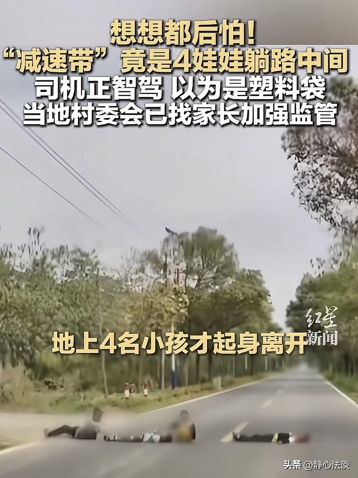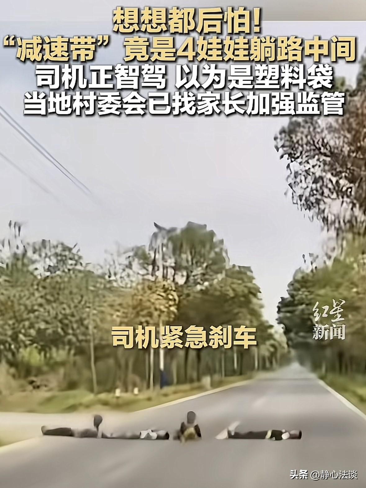 广东清远,男子开车途中开启辅助驾驶模式,系统却突然识别到前方有障碍物并自动减速,男子以远看就像一条减速带,副驾驶的妻子查出异样,急忙让男子刹车,靠近后才发现有4个熊孩子在马路中间平躺成一条直线,车辆停稳后几个小孩起身跑开,男子心都提到了嗓子眼,吓出了一身冷汗。网友:赶紧皮带沾凉水,让他们拥有一个完整的童年! 黄先生开车途中,有点乏累,就开启了车辆的智能辅助驾驶,注意力也稍稍放松了些。 可就在车子平稳前行时,仪表盘突然发出预警,车身毫无征兆地开始自动减速。 黄先生往前一看,路面上有团模糊的障碍物,看起来就像是个减速带,他心里盘算着,绕过去就行。 他压根没放在心上,甚至觉得是辅助驾驶太过灵敏,小题大做。 千钧一发之际,副驾的妻子察觉到了不对劲。 看起来不像是有人躺在地上,她来不及多说,立刻催促丈夫手动接管车辆。 黄先生慌忙解除辅助驾驶,狠狠踩下刹车,轮胎摩擦地面发出刺耳的声响,车子在剧烈的顿挫中硬生生停住。 而车停下的位置,离那个障碍物,仅仅不到一米的距离。 直到这时,黄先生才看清眼前的景象,浑身的血液瞬间冲到头顶,后背出了一身冷汗。 原来那根本不是什么减速,是四个年纪不大的孩子,安安静静地并排躺在行车道上,一动不动。 几个孩子听到刹车声,慢悠悠地爬起来,拍了拍身上的灰尘,一脸淡定地离开。 全程没有丝毫慌张,仿佛刚才躺在车流穿梭的马路上,只是一场再平常不过的游戏。 黄先生停在路边后怕的不行,要不是车有自动刹车,要不是老婆那一嗓子。 今天这四条小命可能就没了,自己这辈子也就完了,倾家荡产都赔不起。 同时黄先生也不理解,这个时间段孩子们本该在家中,在安全的区域玩耍。 却跑到车来车往的县道上躺卧,家长此刻又在哪里? 事发后,相关部门紧急联合村干部入户找到这几个孩子,面对面开展交通安全教育。 第二天,村里还专门联系家长,严肃要求加强对孩子的看管,反复强调非上学时段,更不能放松对孩子的安全监管。 可一句加强教育,真的能堵住孩子们的安全意识吗? 这场惊险的意外,是智驾系统立了功,是妻子的警觉救了场,更是运气站在了所有人这边,但我们不能每次都靠运气保命。 智能辅助驾驶再先进,也只是辅助工具,它能识别障碍物,却管不住孩子往马路上躺。 驾驶员技术再好,也架不住突如其来的危险,反应再快也有来不及的瞬间。 最让人揪心的是,孩子的淡定,恰恰说明这种危险行为不是第一次做。 他们不知道躺在马路上意味着什么,不知道飞驰的汽车有多可怕,更不知道自己差一点就没了生命。 这份无知的勇敢,才是最致命的危险。 有人说,谁家的熊孩子,家长们赶紧出来认领。 皮面沾凉水,赶紧给他们一个完整的童年! 有人觉得太吓人了,司机稍微走个神,或者反应慢半秒,就是四个家庭的悲剧。 这些孩子真是不知道天高地厚,拿生命在开玩笑。 要是真撞上了,司机得坐牢,孩子命没了,家长哭断肠。 有人觉得司机应该当时就下来给他们揍一顿,把棍子打断的那种,回头他父母还得请你喝酒! 不得不提醒有孩子的家长,如果你不狠下心管教,那出去迟早会替你狠狠地教育你的孩子。 孩子小不懂事,大人不能跟着糊涂,马路不是游乐场,毕竟生命也没有彩排的可能。 别让一时的疏忽,酿成追悔莫及的悲剧,别让无知的游戏,毁掉一个家庭的全部希望 《道路交通安全法》第61条:行人应当在人行道内行走,没有人行道的靠路边行走。 四个小孩进入机动车道核心区域躺卧,违反各行其道基本规则,自陷高度危险。 《未成年人保护法》第十六条:未成年人的父母或其他监护人应当保障未成年人的人身安全,预防和制止未成年人进入危险场所、从事危险活动。 四个小孩家长在非上学时段放任孩子在车流县道躺卧,属于未履行监护职责、严重失职。 若因孩子们导致车辆避让受损、第三方事故,家长可能还得全额赔偿。 对此,你怎们看这件事! @静心法谈 学法辨是非,慬法不吃亏。