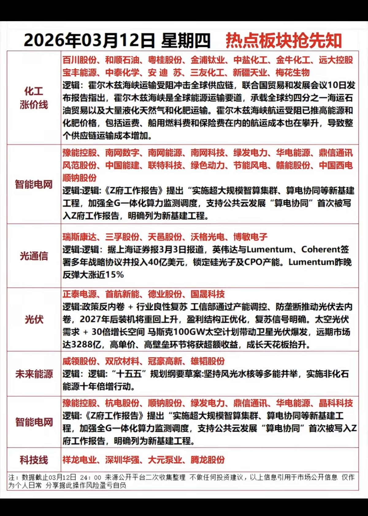3.12周四 市场热点方向+投资逻辑! 1.化工涨价链 2.未来能源 3.光通信 4.光伏储能 5.电网特高压