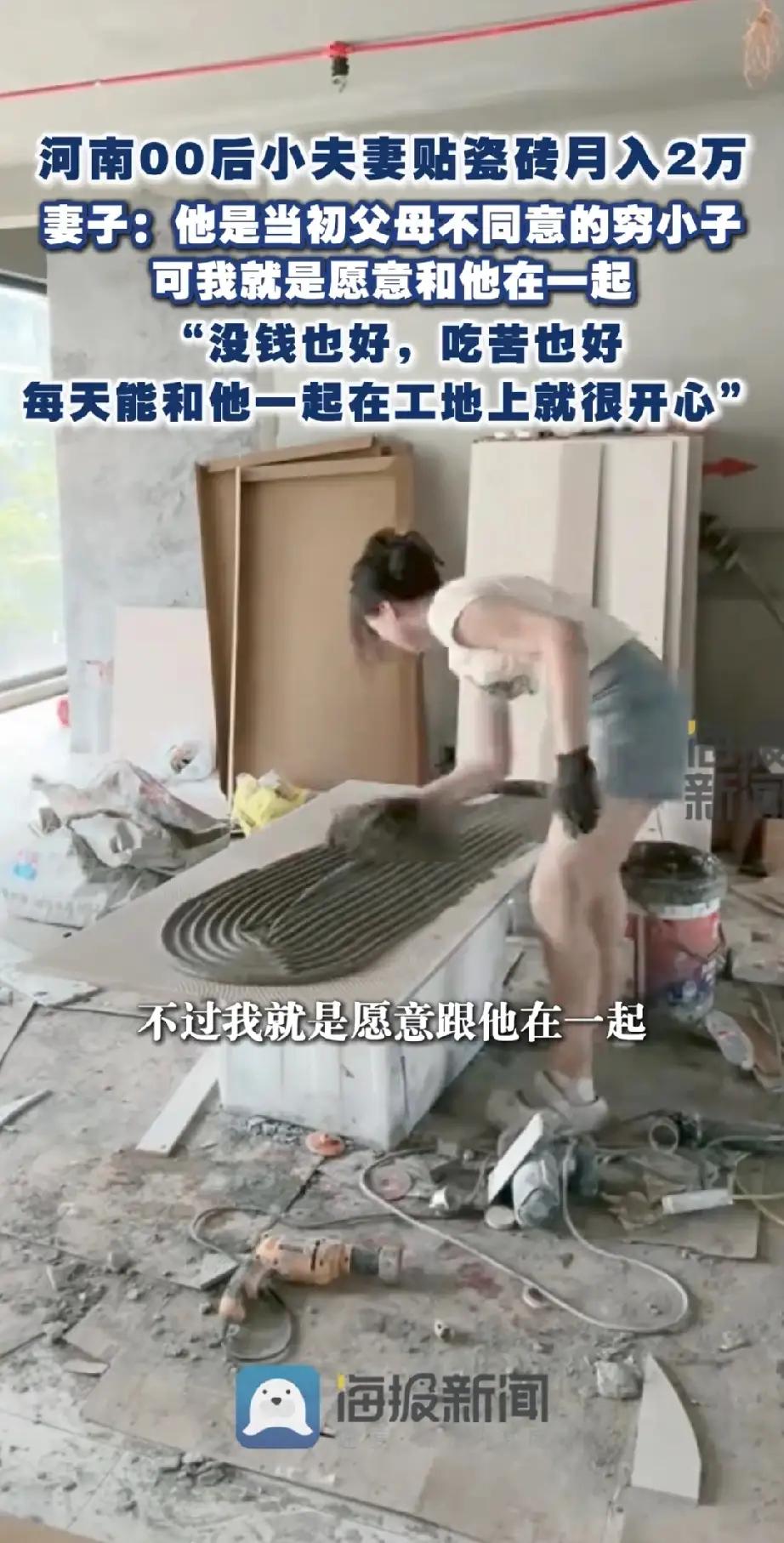 河南周口00后小夫妻贴瓷砖月入2万,妻子说他曾是父母反对的穷小子,我就愿意陪他吃苦,给他打打下手,这样还可以省一个工人!太让人羡慕了! 河南周口这对00后小夫妻用贴瓷砖月入2万的故事,简直是现实版的“逆袭励志大片”!在这个看脸看学历的时代,他们用双手和汗水,书写着属于自己的幸福和未来。妻子那句“我就愿意陪他吃苦,给他打打下手,这样还可以省一个工人”,不仅透露出满满的坚韧和智慧,更让无数人感受到了一种朴实而深沉的爱情力量。 你能想象吗?当初那个被父母反对的“穷小子”,如今靠着手艺和努力,月入2万,带着妻子一起走出困境,走向生活的阳光面。这不仅仅是一个数字的增长,更是他们对命运不服输的宣言。多少人羡慕高薪白领,却忽视了这对小夫妻用双手打造的坚实幸福。他们没有华丽的背景,没有显赫的学历,只有一颗不怕苦、不怕累的心。 更令人感动的是,妻子选择了陪伴和支持,而不是逃避和放弃。她的这份坚定和默默付出,是他们成功背后最温暖的力量源泉。她不仅是他的伴侣,更是最坚实的“战友”和“合伙人”。这种相互扶持、共同成长的爱情,才是最让人羡慕和感动的。 在这个充满诱惑和浮躁的社会,很多年轻人渴望快速成功,却忽略了脚踏实地的重要。周口这对小夫妻的故事告诉我们:幸福不是一蹴而就,而是靠一点一滴的努力和坚持累积起来的。只要心中有爱,有梦想,哪怕是最普通的工作,也能创造出不平凡的生活。 你有没有身边这样努力打拼、相互扶持的情侣或夫妻?他们的故事是否也曾激励过你?欢迎在评论区分享你身边的“逆袭”故事,让我们一起为这些平凡却伟大的奋斗者点赞,传递更多正能量!毕竟,幸福其实很简单,就是有人陪你一起吃苦、一起笑着走过风雨。贴瓷砖的小夫妻励志故事 河南周口两口子贴瓷砖高收入