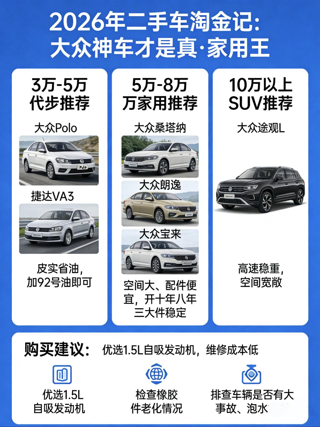 2026年二手车淘金记:大众神车才是真·家用王 各位想买二手车的朋友,今天咱们专唠唠德系里的“老熟人”——大众。 在二手车市场里,大众这牌子就像咱家门口的便利店,车源多、配件便宜、修车师傅满大街都能找着。对于咱们普通家庭来说,买车不就是为了个踏实和方便吗?所以,我今天的建议很明确:想省事、图耐用,大众的这几款“国民神车”绝对值得你列入首选清单。 现在的行情是,新车降价把二手车价格砸得挺狠,以前觉得贵的车,现在预算够得着了。咱们直接按家用车最看重的空间和用途,来看看这几款车的实际行情: 如果你就图个人代步,或者小两口上下班开,省油省心第一位,那大众Polo或者捷达VA3这种小型车、入门级轿车就是首选。现在行情特别实惠,3万到5万左右,你就能买到一辆车况不错的。虽然空间不大,但大众的底盘扎实,开起来稳当,关键是皮实,加92号油就行,随便造也不心疼。这价位的车,买来就是纯代步,刮了蹭了修车也就几百块,心态能放得很平。 稍微把预算提到 5万到8万 这个档口,那选择面就宽了,大众桑塔纳、大众朗逸或者大众宝来是这个价位的绝对主力。这几款车号称“国民家轿”,最大的好处就是空间大、坐着舒服,而且保有量太大了,随便找个路边修车店都能修,配件便宜得跟换手机膜似的。特别是朗逸和宝来,开个十年八年,除了换个轮胎、换个电瓶,发动机、变速箱基本不用你操心,省下的修车钱都够好几年的油钱了。 要是预算能上到 10万以上,想一步到位买个SUV全家用,那大众途观L绝对是这个级别里的“硬通货”。现在10多万的预算,你甚至能买到早期的途观L,虽然内饰看着没现在的新车那么炫,但大众的SUV开着就是有那种德系的厚重感,高速稳如牛,而且空间是真的大,后排坐三个成年人也不挤。对于咱们普通家庭来说,这种车买了不后悔,开个几年再卖也不怎么亏。 给大家几点掏心窝子的建议: 第一,买大众别太迷信涡轮增压。对于二手车来说,1.5L自吸的发动机比带T的要省心太多。维修成本低,对油品不挑,开起来平顺,这就够了。那些双离合变速箱的,低速顿挫虽然有点小毛病,但跑起来之后那叫一个爽,看你能不能接受了。 第二,大众的车,底盘扎实是优点,但年头久了,橡胶件老化是通病。买车的时候,一定要趴车底看看减震那些地方渗没渗油,过减速带听听有没有异响。这都是小毛病,但提前知道,心里有个底,也能拿来砍砍价。 第三,也是最重要的一点,大众的车保有量大,所以事故车也多。买车一定要查记录,别光看外观新就觉得好,一定要确保没大事故、没泡水。 大众的这几款车,就像是那种老实巴交的伙计,不花哨,但能扛事儿。只要你按我说的这几条去淘,肯定能淘到让你省心的伙伴。【来自懂车帝车友圈】