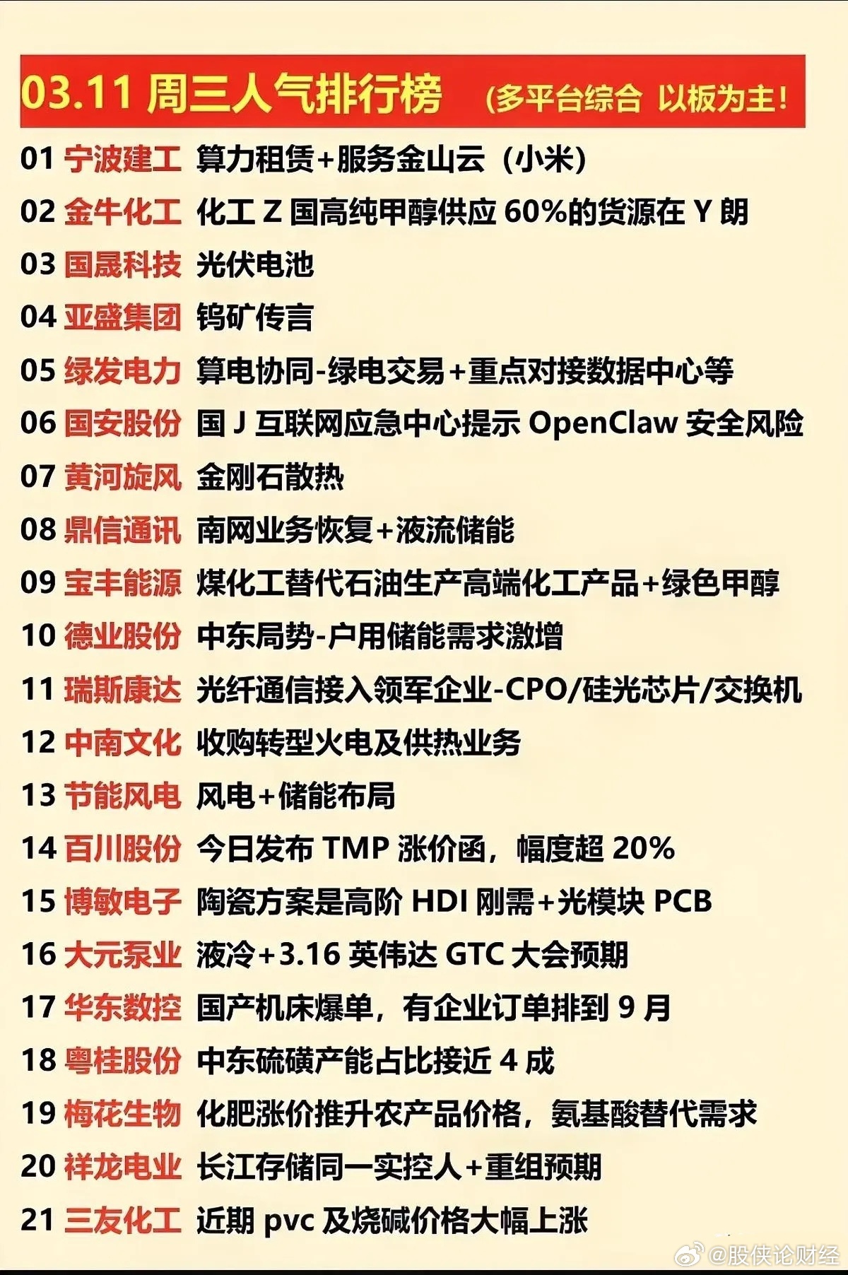 3月11日人气排行榜梳理