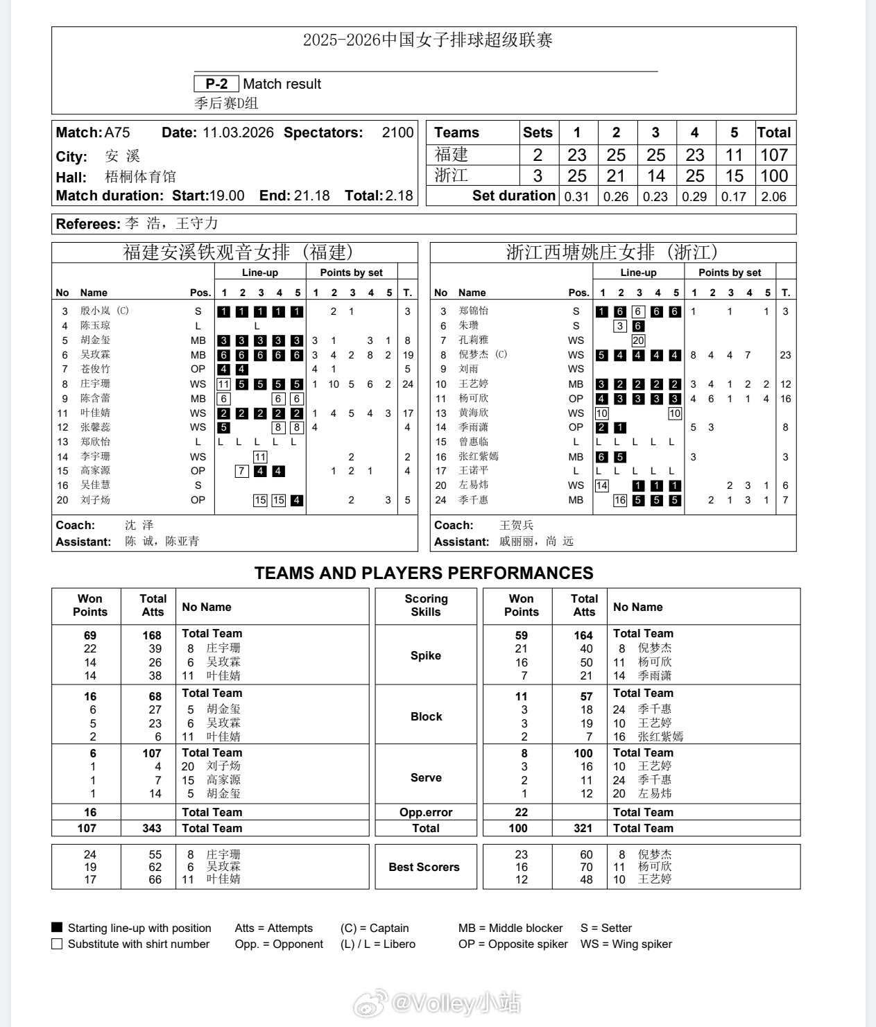 【技术统计】排超联赛季后赛第5轮,福建女排2比3浙江女排(23-25 25-21 25-14 23-25 11-15),庄宇珊新赛季排超首秀24分