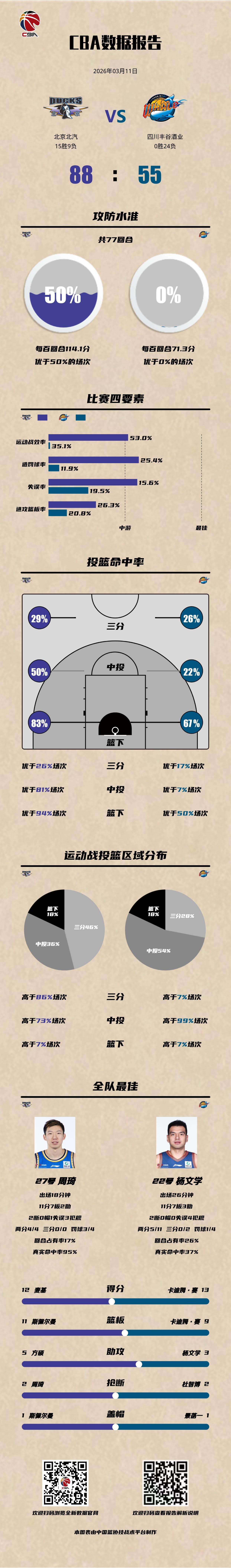 北京北汽 88-55 四川丰谷酒业北京男篮vs四川男篮 北京北汽:麦基12分6篮板3助攻,周琦11分7篮板2抢断,斯佩尔曼9分11篮板; 四川丰谷酒业:卡迪姆·赛13分9篮板2抢断,杨文学11分7篮板3助攻2抢断,景菡一8分6篮板。以城之名