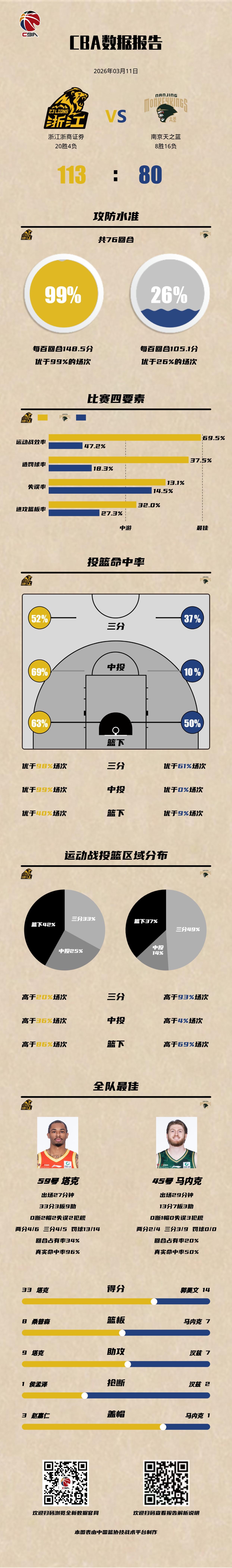 浙江浙商证券 113-80 南京天之蓝广厦男篮vs同曦男篮 浙江浙商证券:塔克33分3篮板9助攻2盖帽,桑普森22分8篮板2盖帽,林秉圣17分6篮板3助攻; 南京天之蓝:郭昊文14分,马内克13分7篮板3助攻,汉兹10分7助攻2抢断。以城之名
