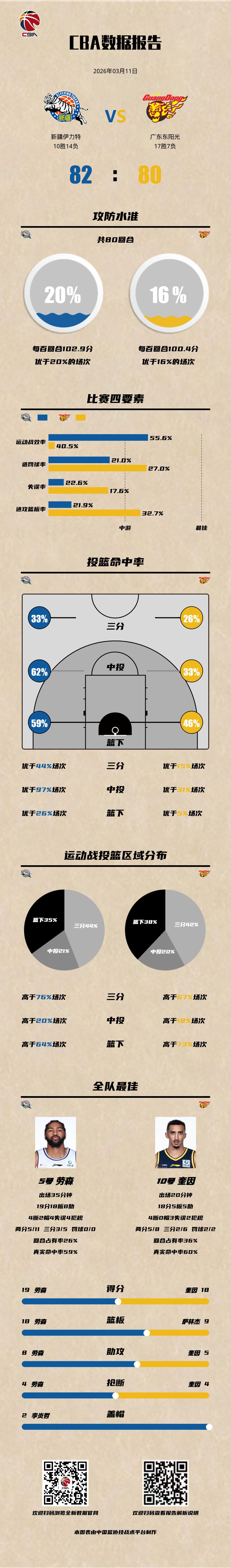 新疆伊力特 82-80 广东东阳光新疆男篮vs广东男篮 新疆伊力特:劳森19分18篮板8助攻4抢断2盖帽,纳托尔12分3篮板4助攻,阿不都沙拉木11分3篮板3助攻; 广东东阳光:奎因18分5篮板5助攻4抢断,胡明轩15分3篮板3抢断,萨姆纳13分2助攻。以城之名