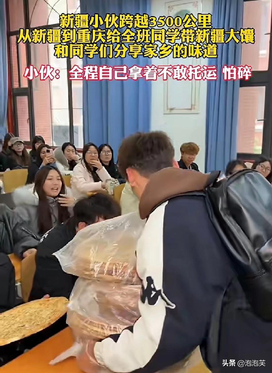 新疆小伙小杨火了 为了给全班同学带家乡的馕 他跨越3500公里从新疆到重庆 全程自己扛不托运怕碎不麻烦别人 到了学校,他把馕分给大家 看着同学们围在一起分享,那一口酥脆的家乡味满是最实在的心意 现在的年轻人,把真诚和浪漫刻进了骨子里 这种纯粹的情谊,真的太暖心了 你被这份同学情打动了吗 你上学时,有没有被同学投喂、暖心照顾过