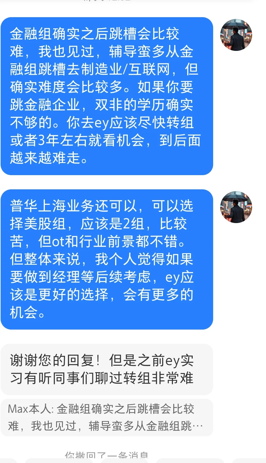 回复:金融组确实之后跳槽会比较难,我也见过,辅导蛮多从金融组跳槽去制造业/互联网,但确实难度会比较多。如果你要跳金融企业,双非的学历确实不够的。你去ey应该尽快转组或者3年左右就看机会,到后面越来越难走。