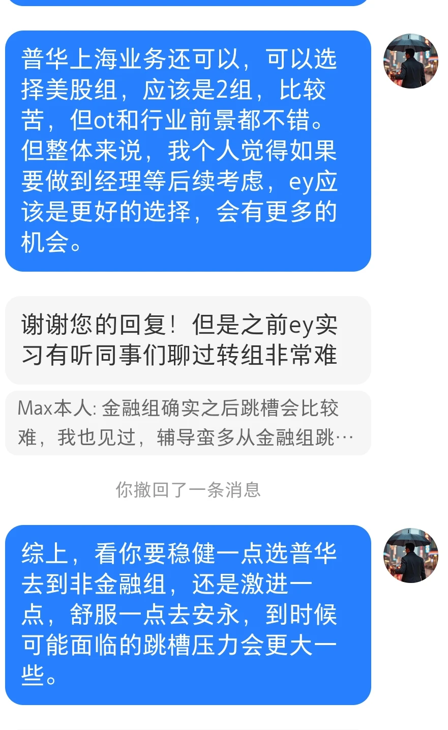 综上,看你要稳健一点选普华去到非金融组,还是激进一点,舒服一点去安永,到时候可能面临的跳槽压力会更大一些。