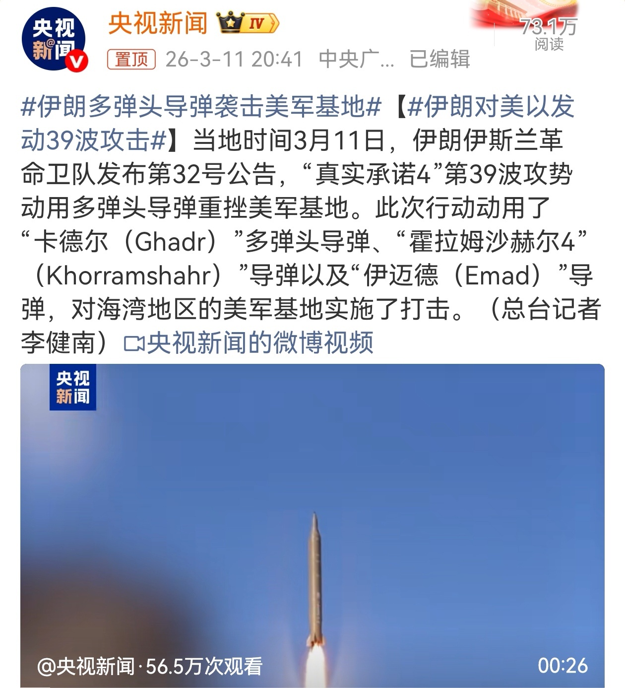160多名无辜的女学生,本该在教室里读书,却沦为了美以发动战争的牺牲品,而美军却在一边甩锅狡辩,一边掩盖真相。这种冷血无情、颠倒黑白的做法,不仅践踏了国际人道法,更暴露了西方霸权的丑陋嘴脸。伊朗多弹头导弹袭击美军基地