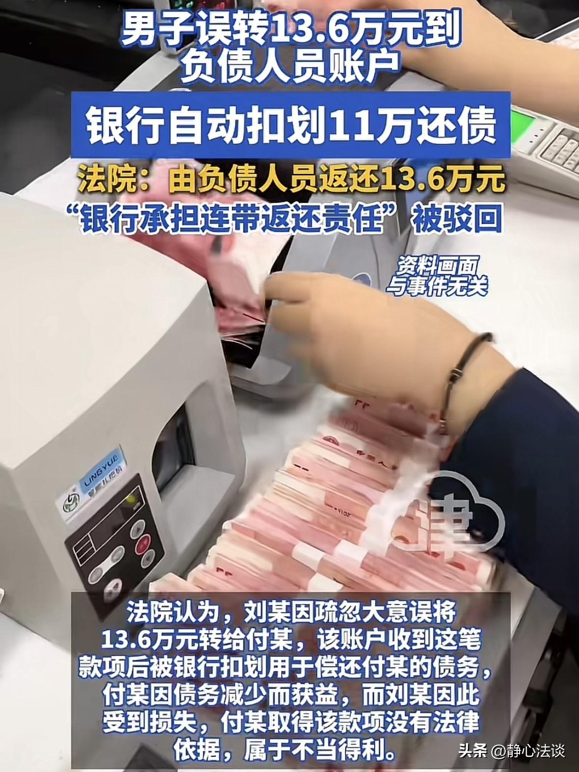 “不是谁惨谁有理!”安徽阜阳,男子误将13.6万元转错人,男子发现后立即联系对方索要归还,谁知对方竟然欠银行的钱,他前脚刚转完,账后后脚就被划扣了11万元抵债,男子不干了,要求对方还钱,对方表示自己没钱,男子又管银行索要,可银行表示扣的账户与他无关,男子不知道如何是好,于是将对方和银行都好上法庭,没想到法院的判决让人意想不到! 谁能想到,转个货款的功夫,13.6万元能直接掉进无底洞里。 那天刘某盯着手机屏幕,想要给生意伙伴打笔货款。 客户的账号他背得滚瓜烂熟,结果他一个不小心,手指一滑,输错了帐号。 等他反应过来,13.6万已经从自己账户里消失。 他赶紧查看,收款人名字不是合作多年的老客户,是个完全陌生的付某。 刘某当时脑子嗡的一声,第一反应是找银行止损。 可银行表示钱已经到对方账户了,没法直接退,得自己找收款人协商。 等他辗转联系上付某时,对方支支吾吾说不清楚,再一查账户,13.6万只剩下两万多。 原来付某一直欠银行钱,刘某把钱转进去以后,被银行自动扣走11万元,用来偿还付某拖欠已久的欠款。 刘某一下就急了,自己转错钱是自己粗心,但银行凭什么扣我的钱?这钱又不是付某的。 他找银行理论,银行拿出合同,付某和他们签了借款合同,到期不还,他们则有权扣划他账户里的钱。 后来刘某找到付某要钱,对方要么躲着不见,要么哭穷卖惨。 对方说自己都欠一屁股债了,根本没钱还,银行扣的钱,你找他们要去。 皮球踢来踢去,刘某成了最冤的那个,钱没了,货没收到,还得自己打官司。 刘某实在没办法了,把付某和银行都告上了法院。 刘某表示自己不认识付某,误转的这13.6万本来就不该是付某的。 银行扣的是自己的钱,要承担连带责任,把钱还给他。 银行那边拿出厚厚一叠证据,借款合同、逾期通知、生效法律文书。 每一张都在说,我们扣付某的钱,是合法合规。 他账户里的钱,不管来源是什么,都是他的财产,我们有权扣划抵债。 付某则全程隐身,只在法庭上露了个脸,说自己确实收到了钱,但都被银行扣了,我一分钱都没拿到。 法院经过审理,却给了所有人一个意料之外,情理之中的答案。 判决付某必须返还刘某13.6万元,银行不承担任何责任。 理由是,付某拿到这笔钱,虽然自己没花,但他欠银行的债少了11万,等于实实在在得到了,属于不当得利,必须全额返还。 银行扣划是基于和付某的合法借款合同,是在行使债权人的权利。 程序合规、依据充分,不算不当得利,所以不需要担责。 对于这个结果,刘某无法接受,于是上诉后,二审法院在本月初作出判决,驳回上诉,维持原判。 这个结果一出,网上吵翻了天。 有人骂判决不近人情,刘某已经够惨了,扣了他的钱,凭什么不用负责? 有人挺法院没毛病,银行要是随便退钱,那欠债的都能找个人转钱再要回来,那不全乱套了。 但大多数都觉得这是刘某实在太粗心,13.6万,对于一个普通家庭可能是一两年的收入,这代价也太大了! 现在现实摆在眼前,判决是判了,但刘某能不能拿到钱,还是个未知数。 不得不说,转账前,一定一定要反复核对,哪怕多花30秒,也别省这一步。 就算真转错了,第一时间报警,联系银行,尽量冻结对方账户,别等钱被花完了才后悔。 别指望有人兜底,在哪都讲的是证据和规则,不是谁惨谁有理。 《民典法》第981条:得利人知道或者应当知道取得的利益没有法律根据的,受损失的人可以请求得利人返还其取得的利益并依法赔偿损失。 付某在明知账户收到不明款项后,未主动返还,属于明知无依据获利,刘某可主张返还本金及相应利息损失。 对此,你觉得这个判决合理吗? @静心法谈 学法辨是非,慬法不吃亏。