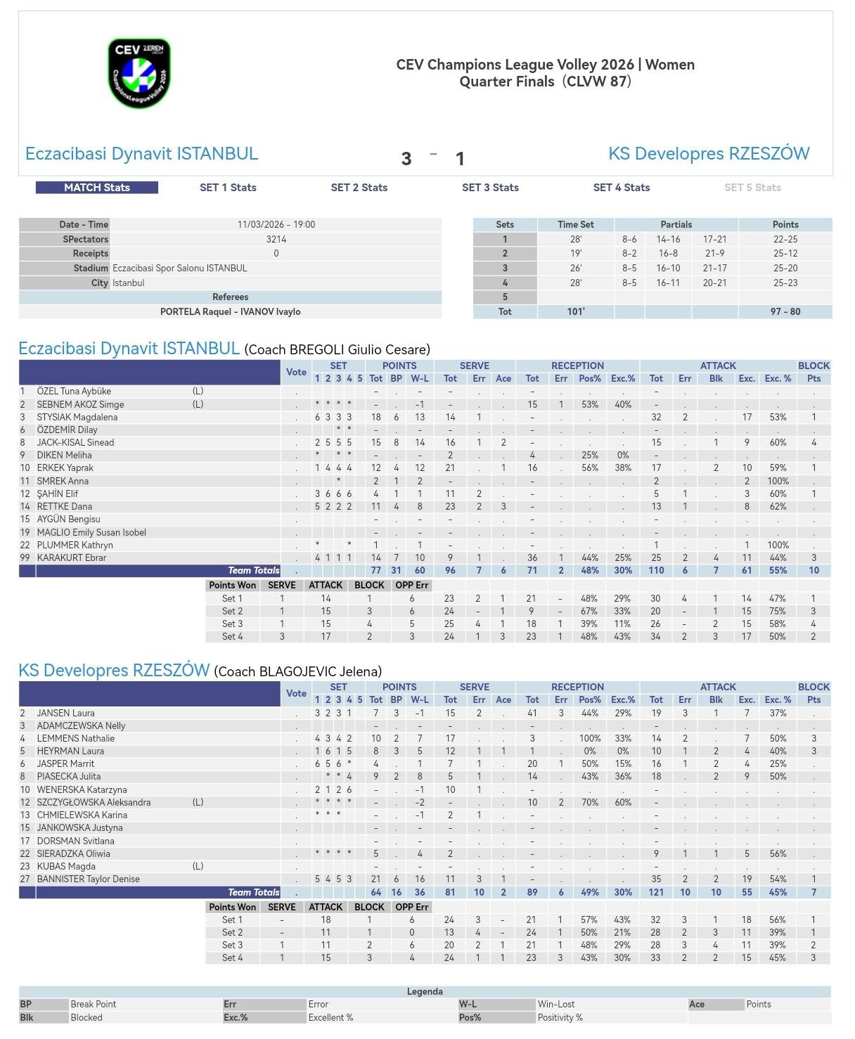 伊萨奇巴希赢得欧冠首回合 2025-2026意甲女排1/4决赛首回合,伊萨奇巴希主场3-1波兰热舒夫抢得先机,比分22-25, 25-12, 25-20, 25-23。 伊萨奇巴希: 斯蒂夏克32扣17中2失0被拦、1拦0发18分 杰克15扣9中0失1被拦、4拦2发15分 卡拉库尔特25扣11中2失4被拦、3拦0发14分 亚普拉克17扣10中0失2被拦、1拦1发12分 雷特克13扣8中1失0被拦、0拦3发11分 E.沙辛5扣3中1失0被拦、1拦0发4分 斯姆雷克2扣2中0失0被拦、0拦0发2分 普拉默1扣1中0失0被拦、0拦0发1分 热舒夫: 班尼斯特35扣19中2失2被拦、1拦1发21分 莱门斯14扣7中2失0被拦、3拦0发10分 皮亚塞茨卡18扣9中0失2被拦、0拦0发9分 海尔曼10扣4中1失2被拦、3拦1发8分 扬森19扣7中3失1被拦、0拦0发7分 谢拉兹卡9扣5中,1失误1被拦,0拦0发,5分 玛丽特.贾斯珀16扣4中1失2被拦、0拦0发4分 伊萨奇巴希-热舒夫: 扣球得分:61-55 拦网得分:10-7 发球得分:6-2 对方送分:20-16 总得分:97-80 一传到位率:48%-49% 一传完美率:30%-30%
