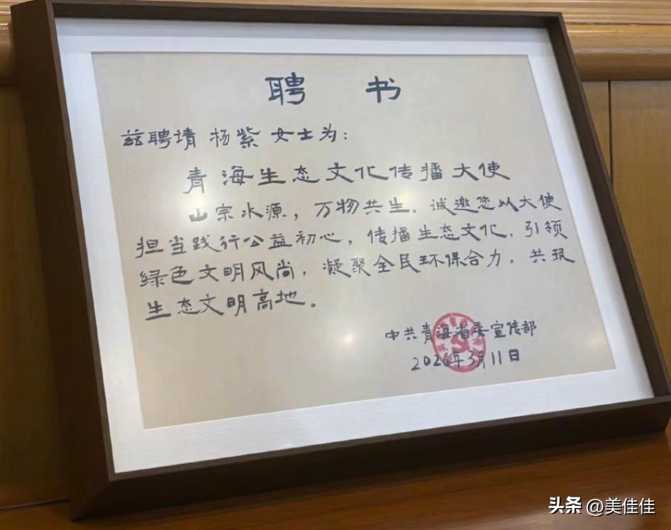 ✨ 杨紫受聘为青海生态文化传播大使,以星光守护高原绿意! 一纸聘书,承载着山宗水源的嘱托;一份初心,联结着演员与高原的羁绊。杨紫正式受聘为青海生态文化传播大使,在飞机上收到的“小树来信”里,藏着青海对这位使者的温柔期许。 从《生命树》中扎根高原的角色,到现实里为生态发声的使者,她用自己的微光,让更多人看见青海的纯净与壮美。三江源的潺潺流水、守护自然的牧人身影、风雪里不曾动摇的生态信念,都在她的讲述中变得鲜活可触。 “山宗水源,万物共生”,这不仅是聘书上的字句,更是她践行公益的初心。愿我们都能在心中种下一棵常青的生命之树,跟着这位高原使者的脚步,凝聚环保合力,共筑生态文明高地,让青海的绿意永远蓬勃生长。
