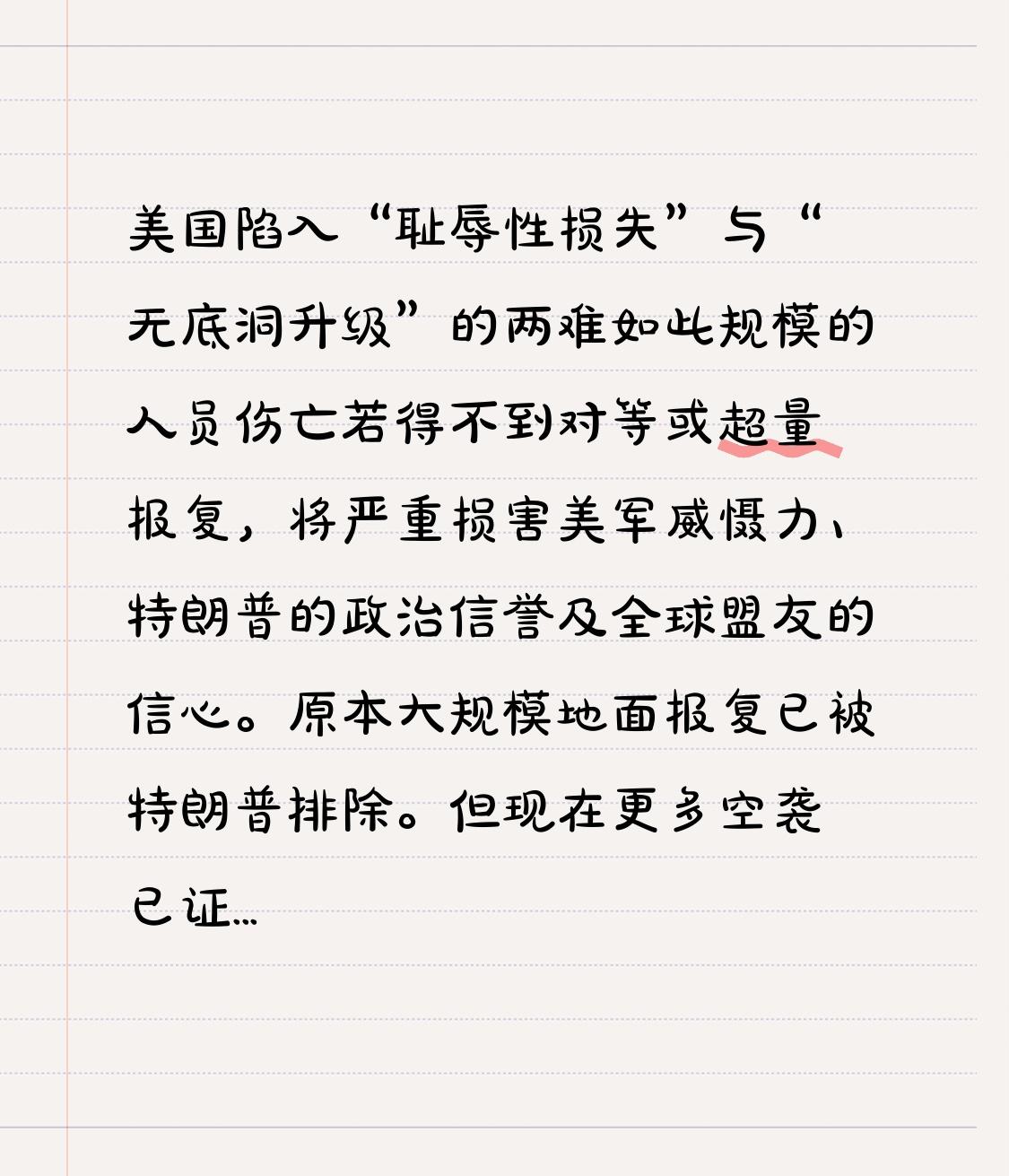 美国陷入“耻辱性损失”与“无底洞升级”的两难 如此规模的人员伤亡若得不到对等或超量报复,将严重损害美军威慑力、特朗普的政治信誉及全球盟友的信心。原本大规模地面报复已被特朗普排除。但现在更多空袭已证明无法阻止伊朗反击。若升级选项打击伊朗本土城市或领导层将导致全面战争,违背其“结束”初衷。美国正陷入 “打不赢、输不起、退不出” 的经典困境。