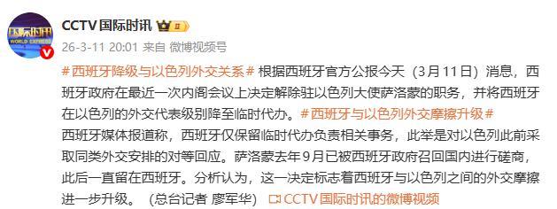 3月12日,据央视新闻直播间报道,昨天,西班牙首相桑切斯宣布,立即招回驻以色列大使。 评论,这是对美以对伊朗军事行动的回应,以色列总理内塔尼亚胡作恶多端,特别是轰炸伊朗石油设施,遭到世界各国强烈谴责,认为以色列总理内塔尼亚胡在美国总统特朗普支持下无法无天了!没有不敢炸得了。 因此,西班牙不与狼共舞,与以色列分道扬镳。